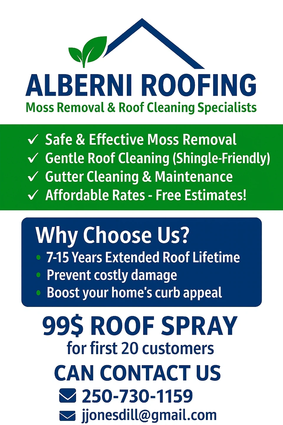 60Tired of roof stains, moss, and algae? This is a safe, eco-friendly, and professional solution with no shingle damage. It comes with 1-year return protection: if moss comes back, retreat for only 20-30% of your original cost. $99 Starter Roof Spray for the first 20 homeowners only!
