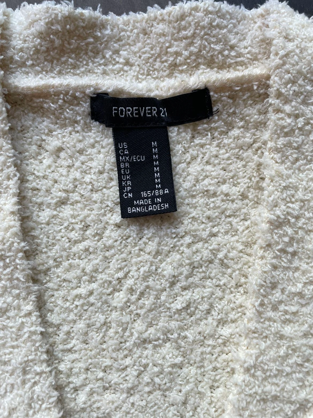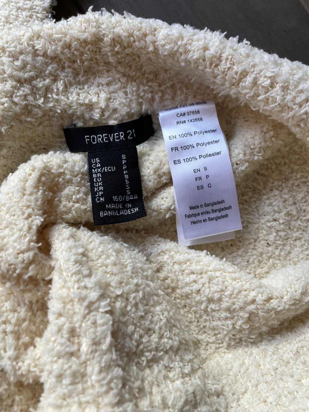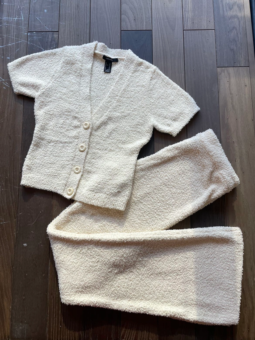 Cardigan top is M but fits like S, bottom is S but can fit XS-M, flared bottom.