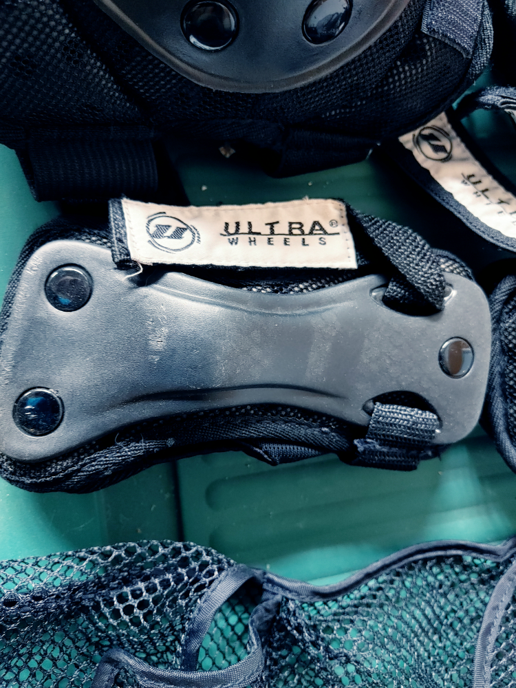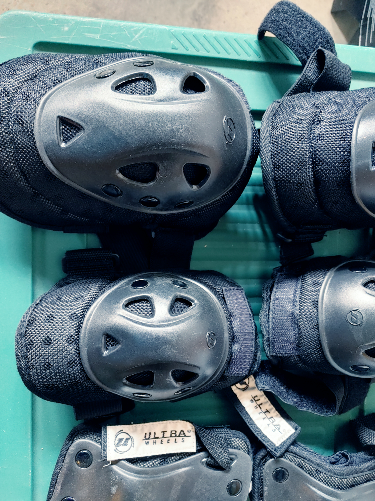 Slightly used Women's protective pads for rollerblading, etc. Some slight scratches, nothing major or ripped. Size medium. Includes 2 knee pads, 2 elbow pads, 2 wrist gaurds, and 1 storage pouch.