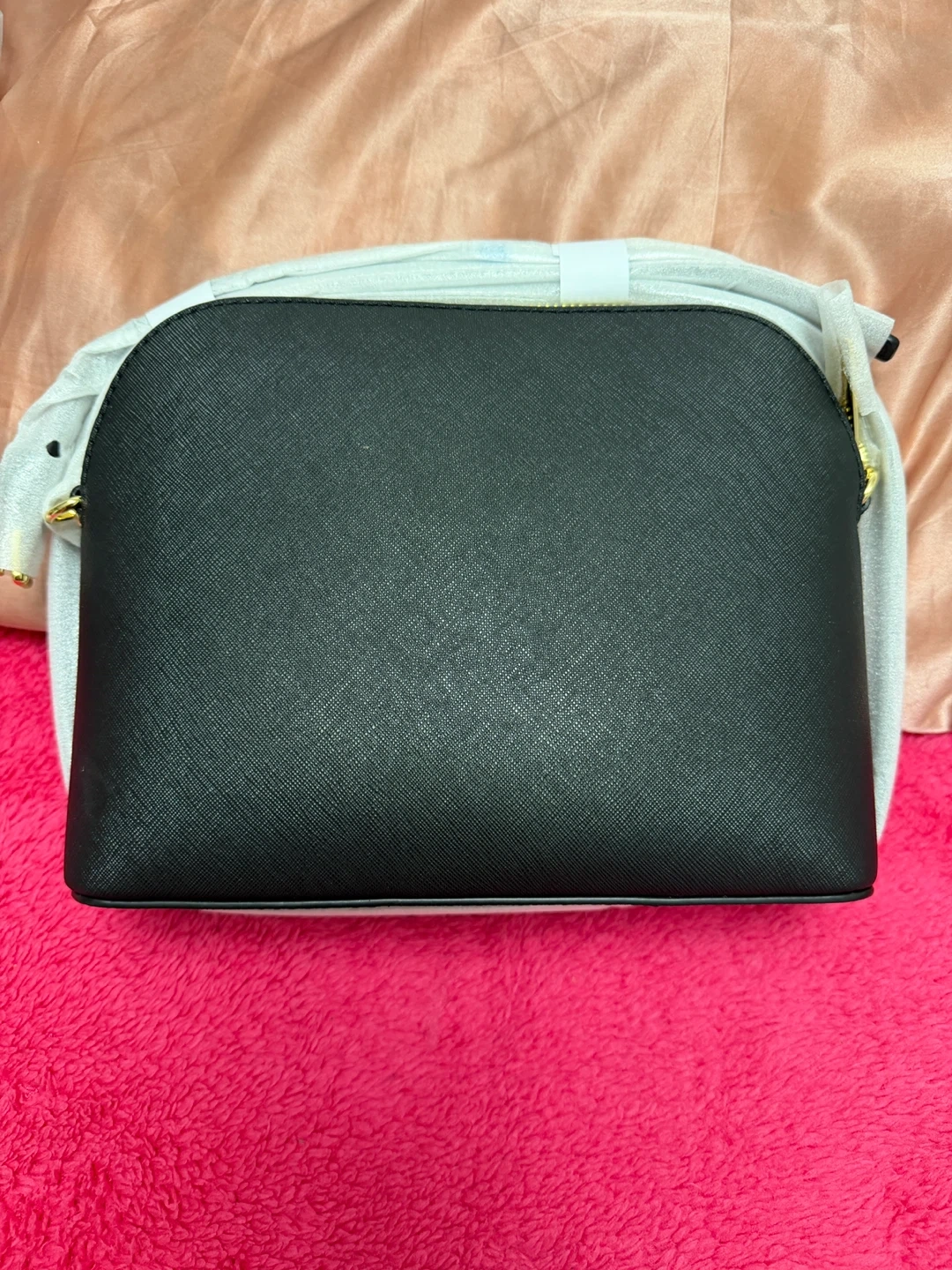 This is a Michael Kors black leather crossbody bag. It's made from saffiano leather and features a zip closure. The bag's dimensions are approximately 9"W x 6"H x 3"D. It's a classic size for everyday use!