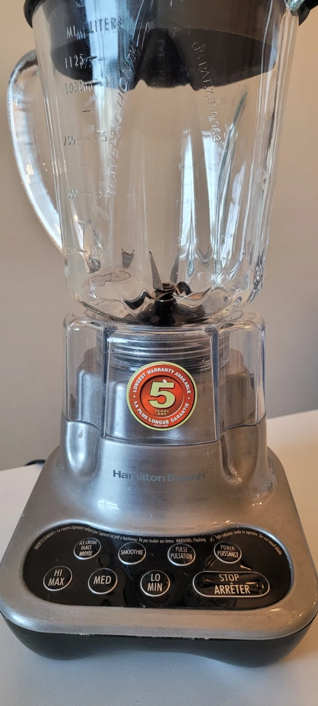 This Hamilton Beach blender features multiple speed settings, including high, max, medium, low, and 1.0 min. It's designed for various blending tasks, from crushing ice to making smoothies. The pitcher appears to be glass and has measurement markings. This appliance would be useful for quick meal prep or beverage making.