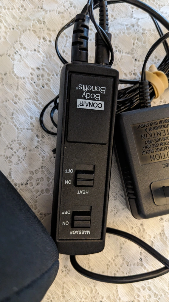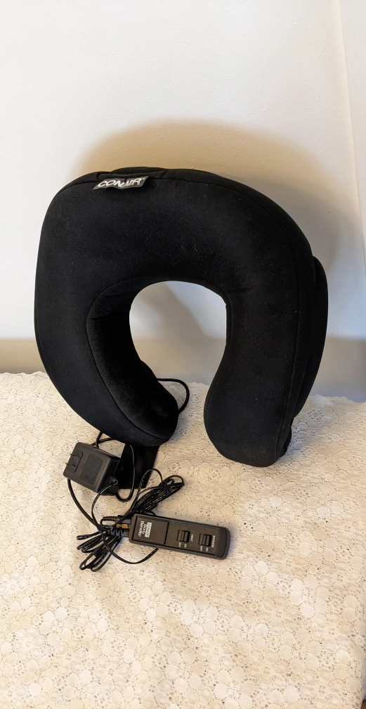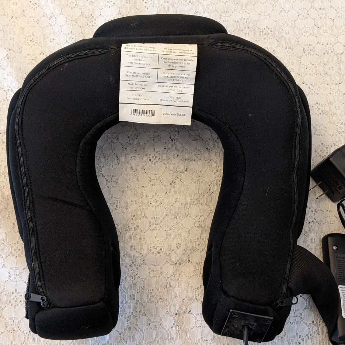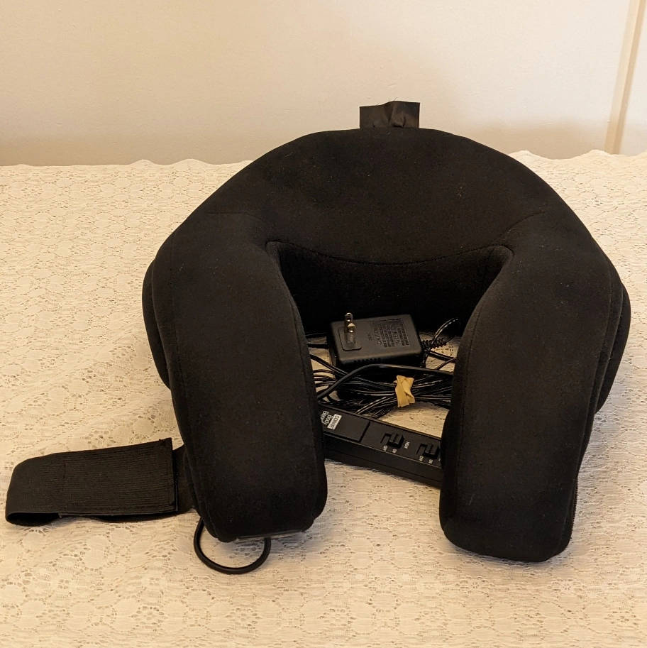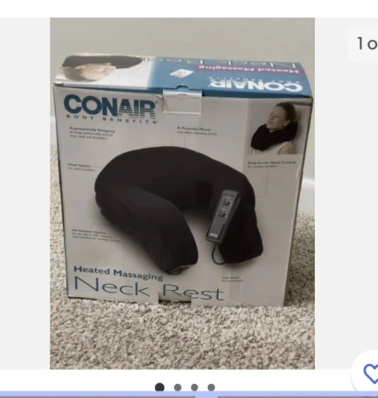 Pre-loved barely used in great condition. Ergonomically designed, with a velcro strap to keep it snug around your neck. The plug cord is about 10.5 feet long. The remote has massage and heat controls. The box seems to have left our home, photo placed in listing for description purposes.