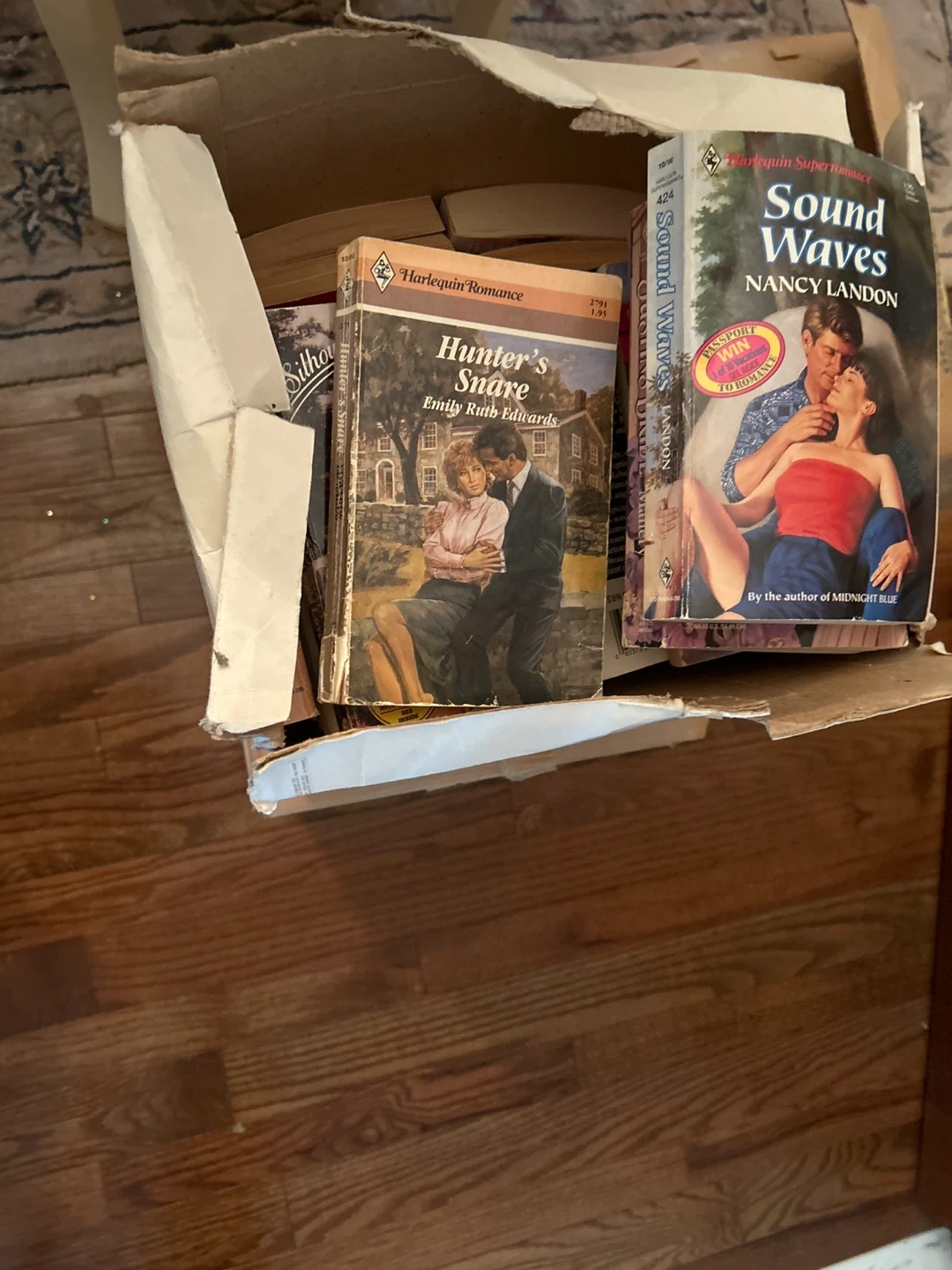 Bundle of two Harlequin Romance novels: "Hunter's Snare" by Emily Ruth Edwards and "Sound Waves" by Nancy Landon. Includes original paperback books.