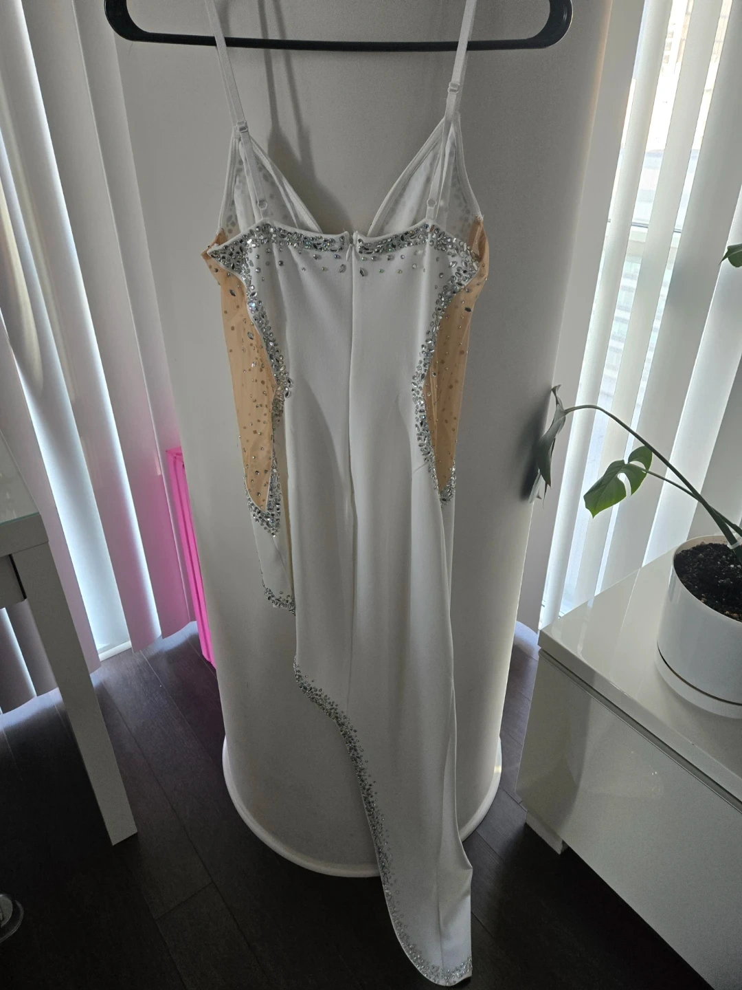 This stunning white maxi dress features intricate rhinestone detailing and sheer mesh panels. It has a flattering asymmetrical hemline and adjustable spaghetti straps. Perfect for a special occasion!