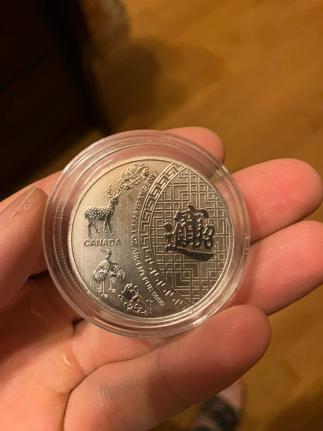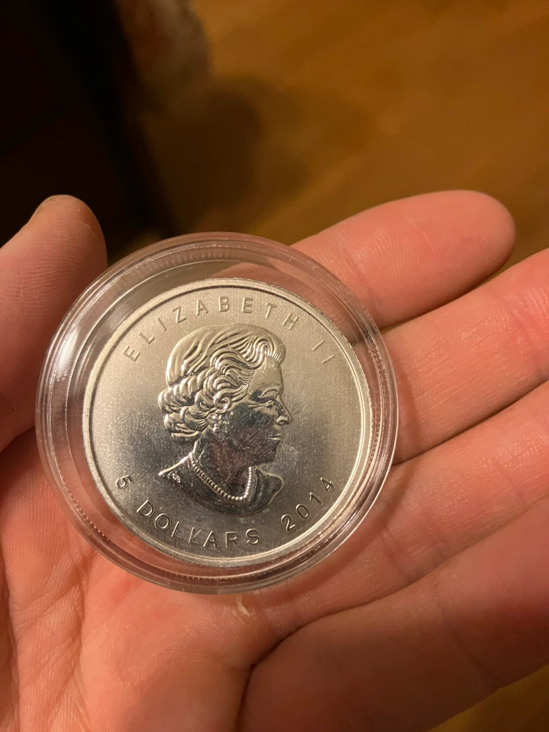 Selling a Canadian silver coin with a face value of $5 dollars from 2014! It features Queen Elizabeth II on one side and a design with Canadian wildlife on the other. A great item for collectors