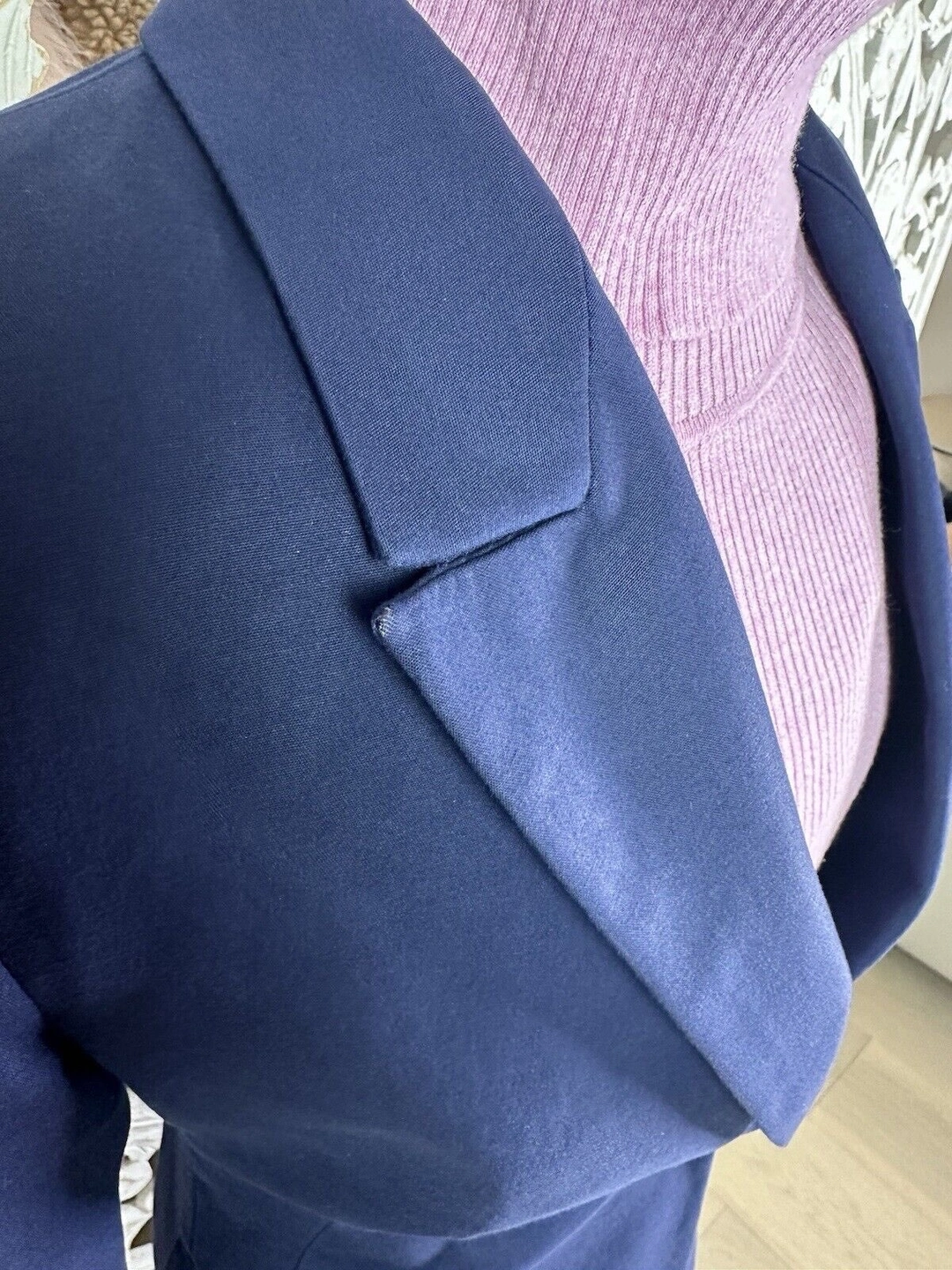 Pre-owned and in good condition. Relatively clean with signs of normal wear—no odors, stains, or fabric flaws. There is some darkening along the inside edge of the collar and on the folds of the cuffs. The lining inside one pocket is ripped, and there's a small white dot on the bottom of the left sleeve. I've worn the jacket a handful of times. You may want to dry clean or hand wash it with delicate detergent and air dry. I do this with all my dry-clean-only clothes and have never had an issue.