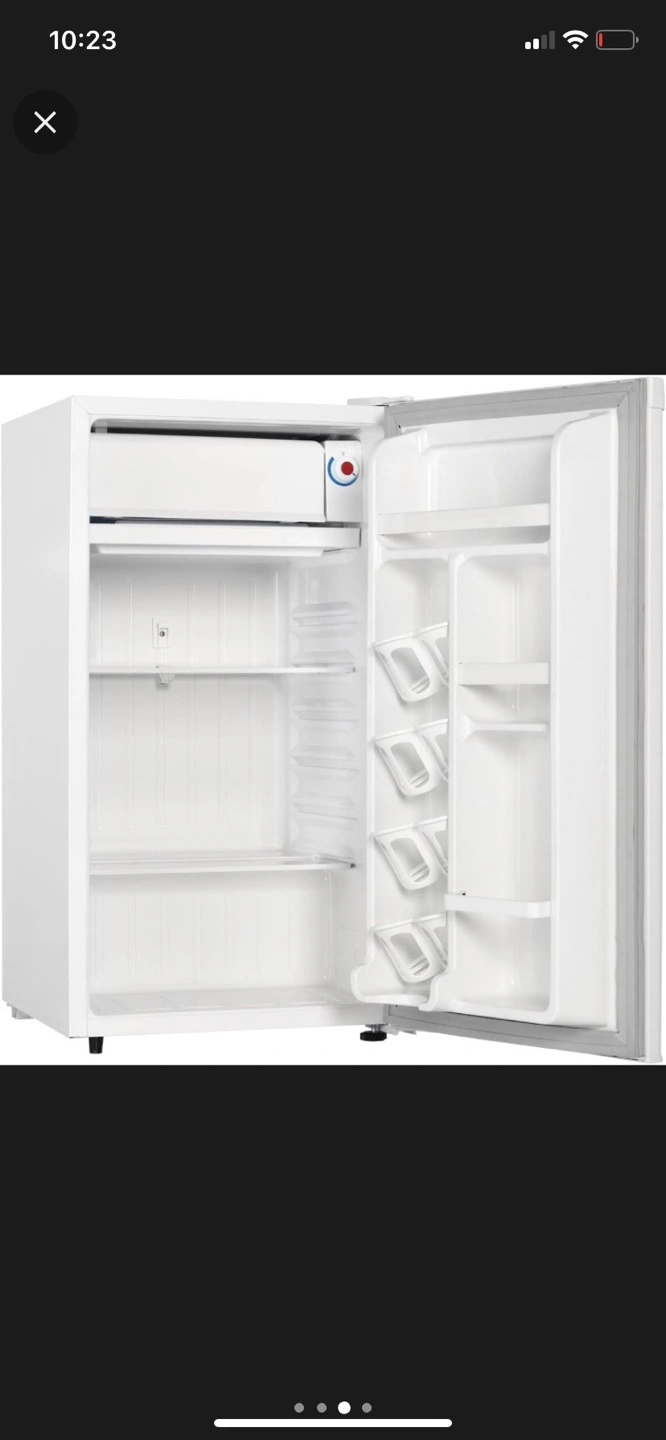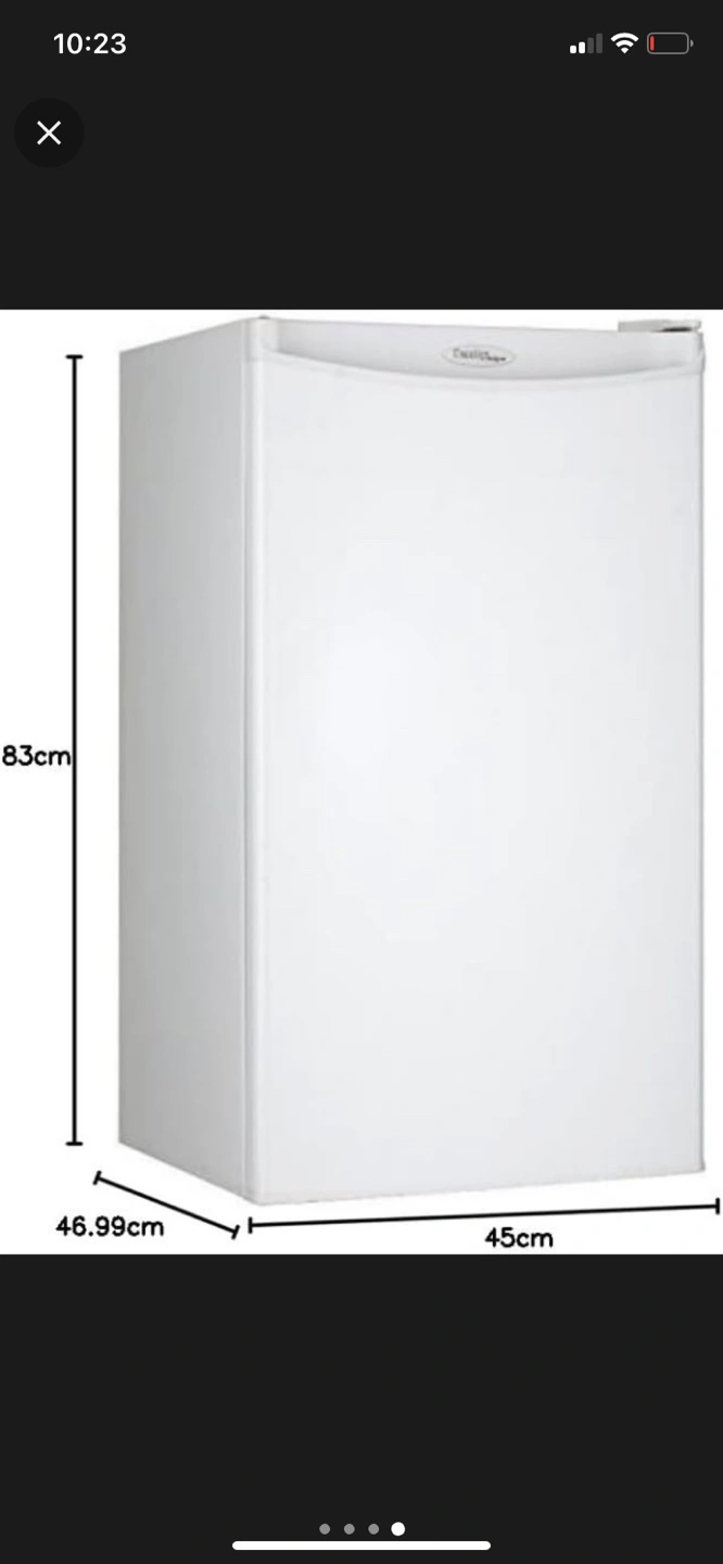 White compact refrigerator, excellent for small spaces. Multiple shelves and door bins. Clean and functional. Measures 83cm x 46.99cm x 45cm.