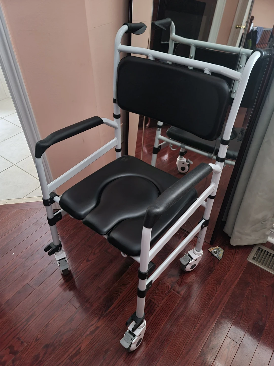 Selling a commode chair with wheels! Never used. Perfect for anyone needing a bit of extra assistance. The chair is sturdy and has a comfortable seat and backrest. Pail included, which mounting under chair.