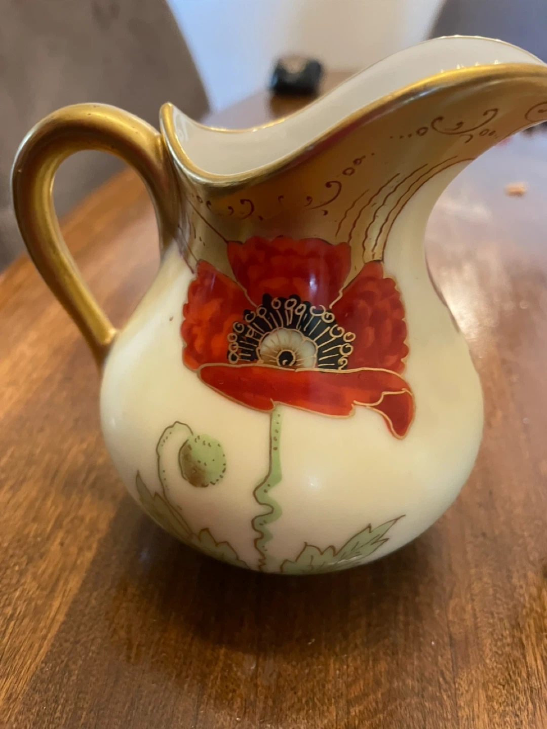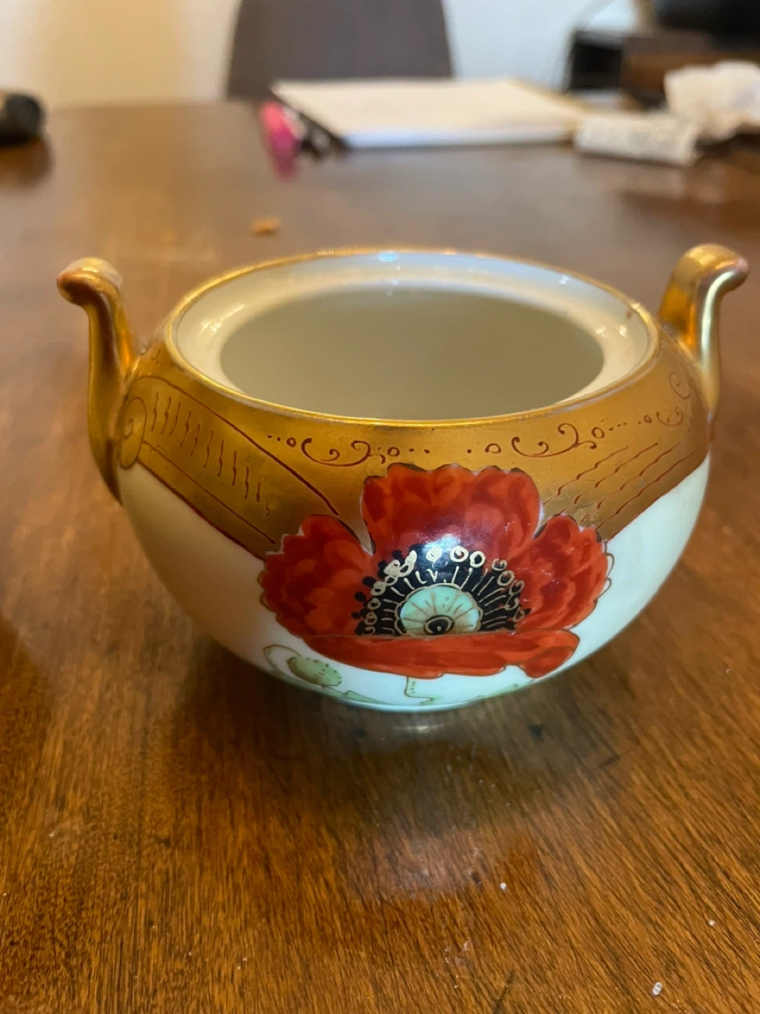 This is a delicate handpainted porcelain sugar bowl from Austria. It features a vibrant red poppy design with gold accents. The bowl has two small handles.