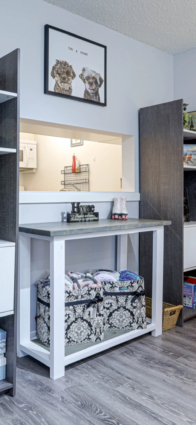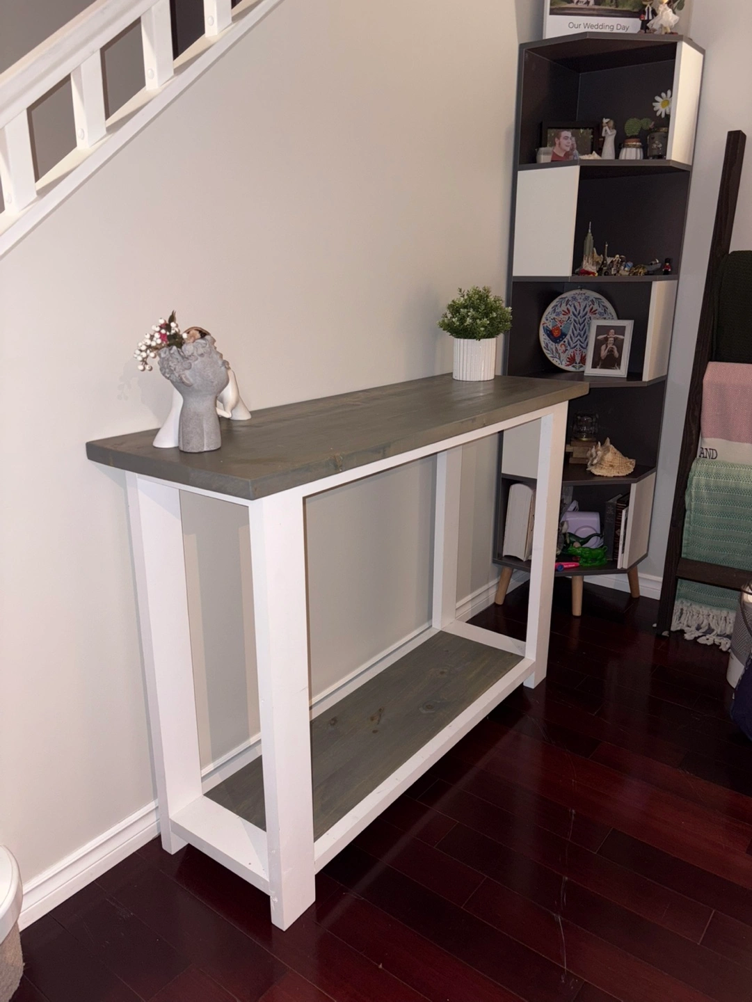 Handmade grey and white console table. Solid wood construction. Features a lower shelf. Great for entryway or living room.