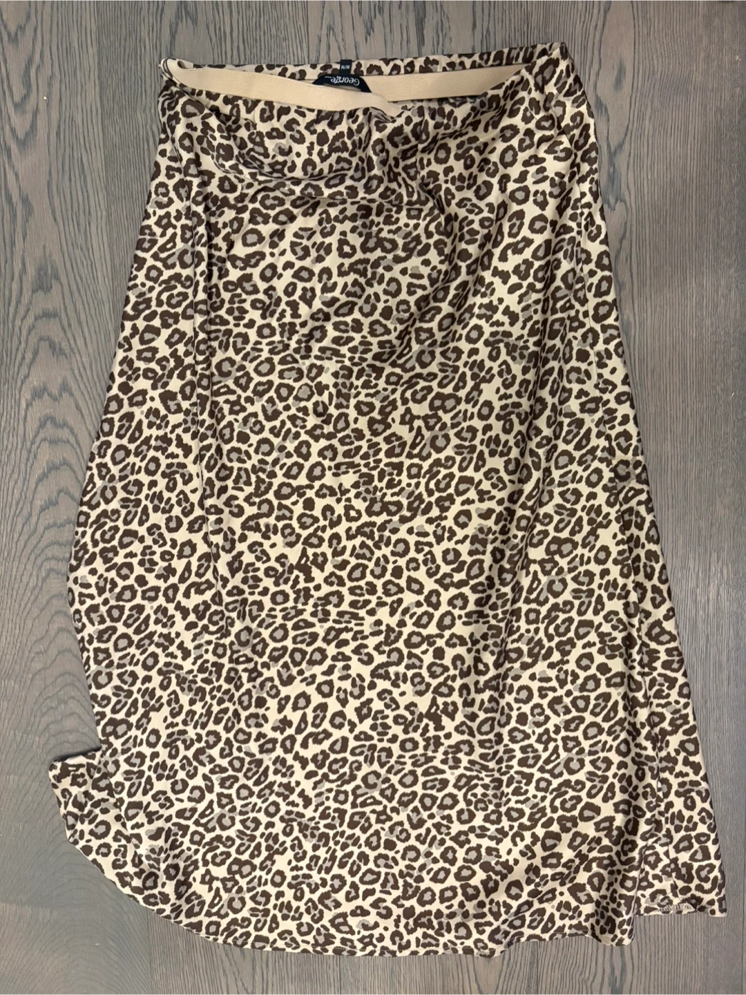 It's a George leopard print maxi skirt. The fabric feels silky. This skirt is a medium size and features an elastic waistband.
