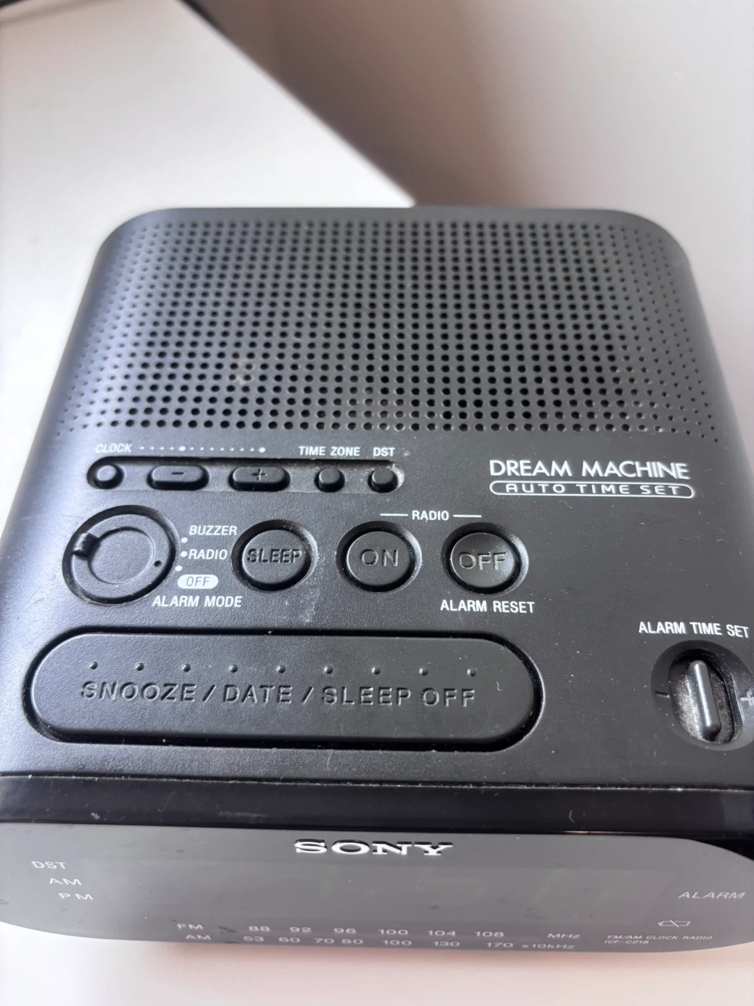 This Sony Dream Machine clock radio offers AM/FM tuning and an auto time set feature. It includes a snooze button and alarm functionality. Power back up is provided by a lithium battery.