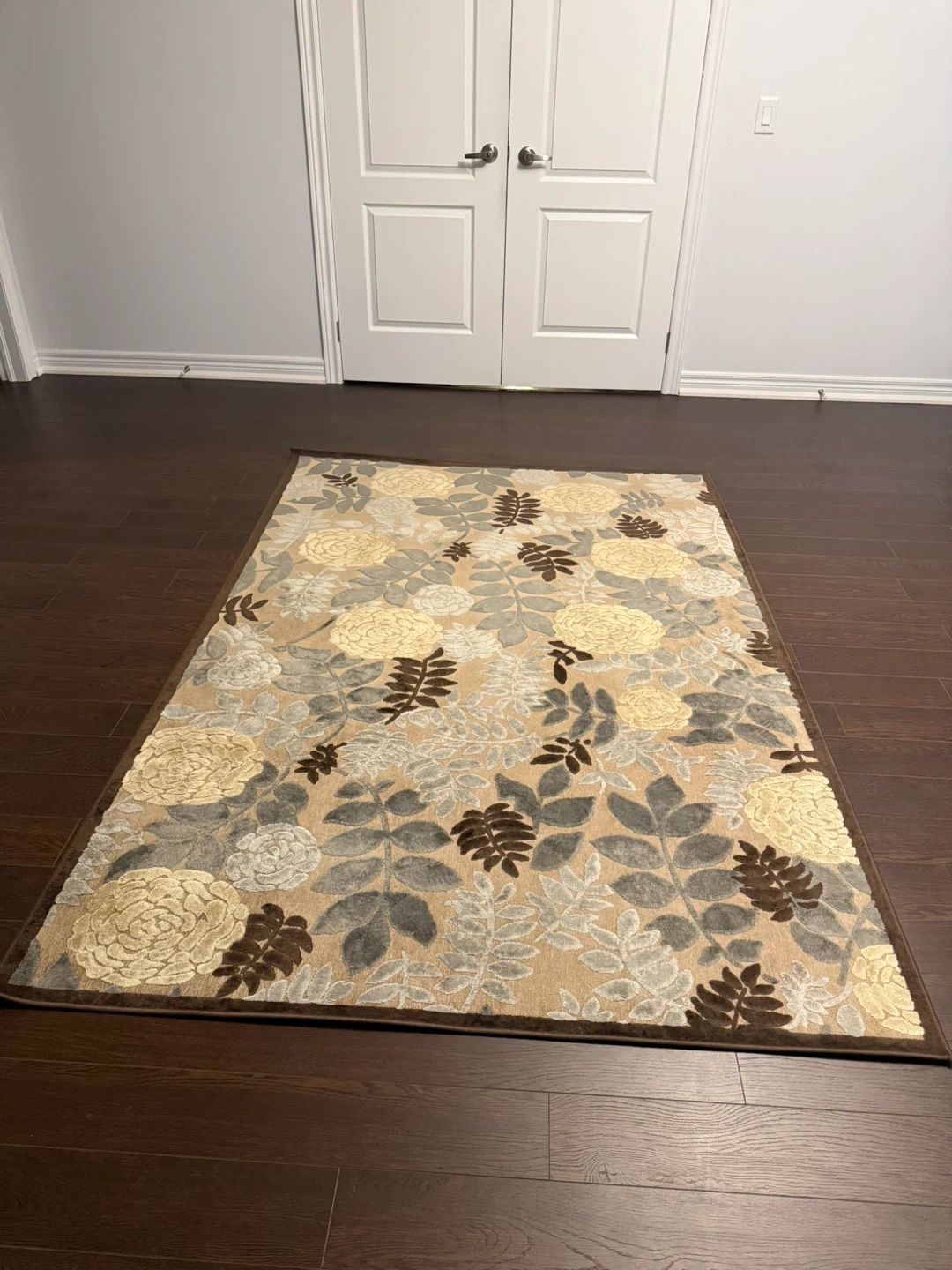 Beige area rug with a large floral and leaf pattern. The design features cream, grey, and brown tones. It has a dark brown border.