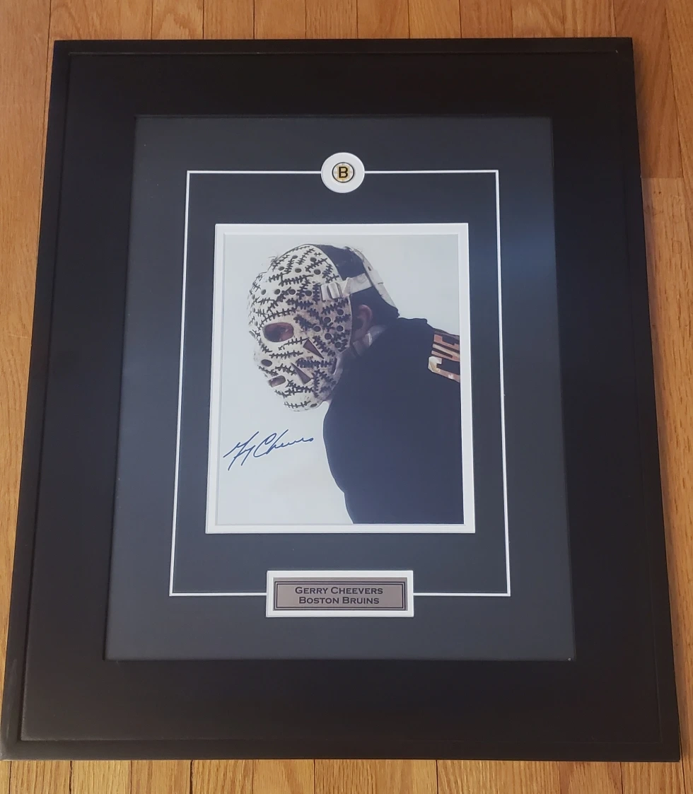 Framed photo of Gerry Cheevers, signed. Features a picture of Cheevers wearing his iconic mask.