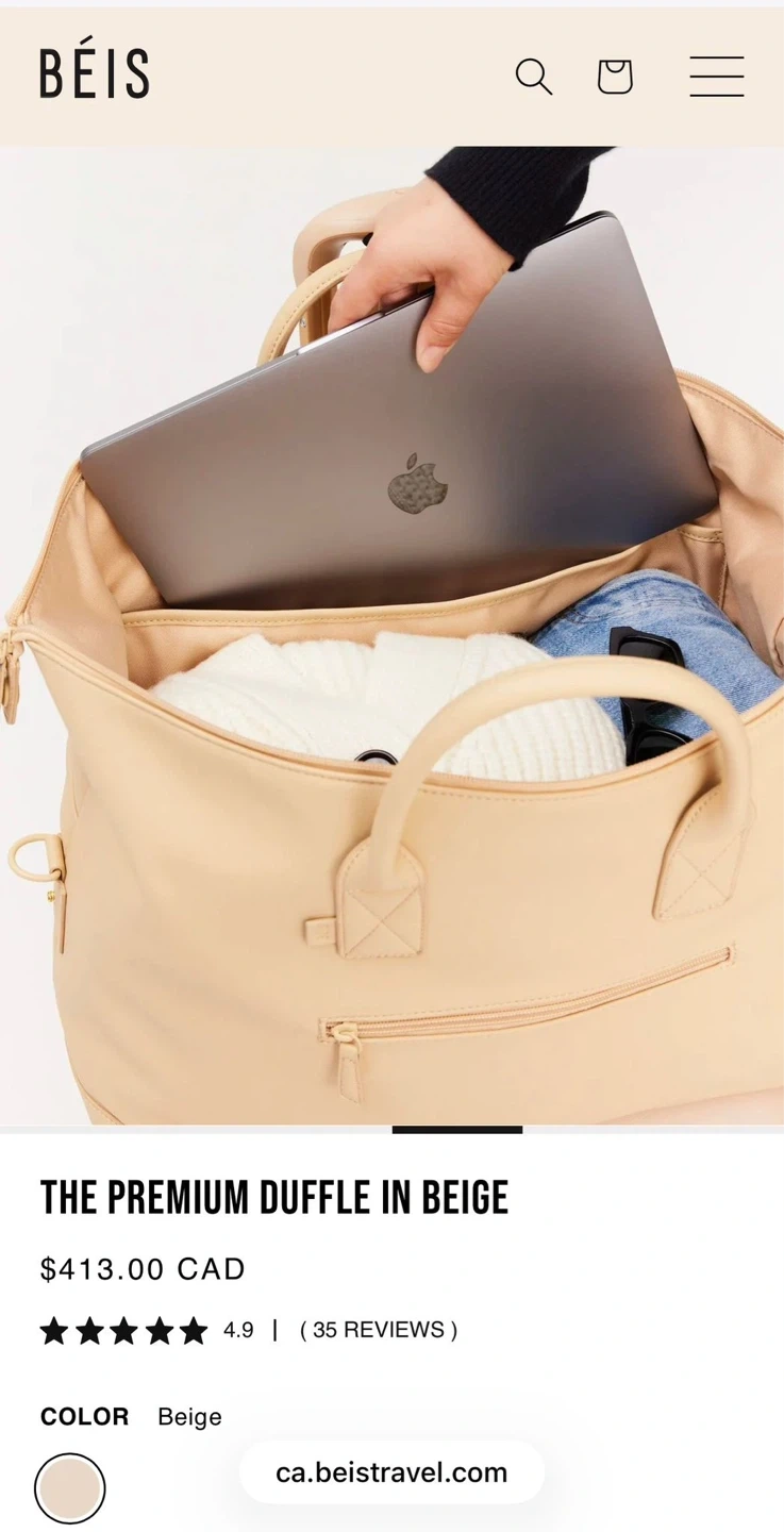 Béis The Premium Duffle in beige. This spacious bag is perfect for weekend getaways. It features a durable construction and a stylish design.