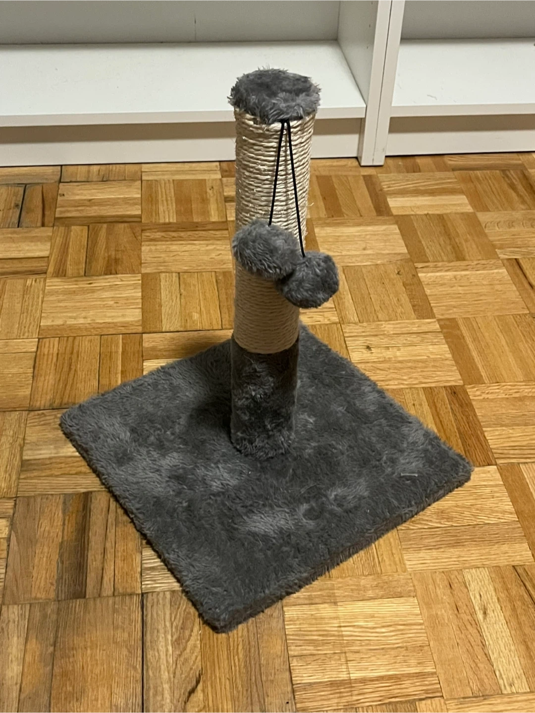 Compact cat scratching post covered in sisal rope and plush fabric. It features a dangling toy for added fun. Perfect for keeping your cat entertained and their claws healthy!