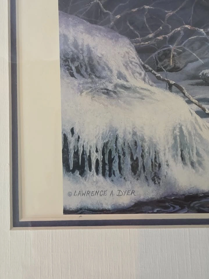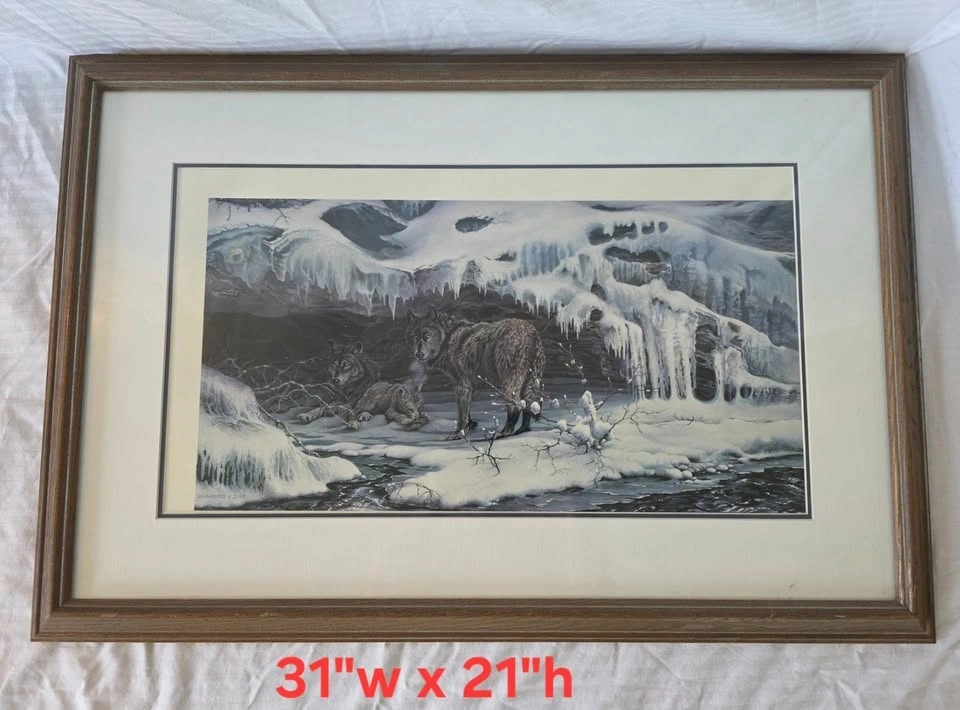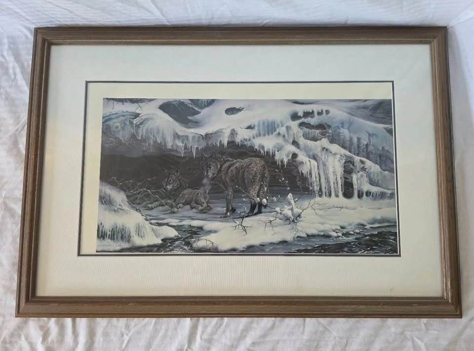 Limited Edition framed print #22 of 25. It displays wolves looking over their whelps in an ice cave by the river. The detail and colours are magnificent, making this a treasured addition to any room.