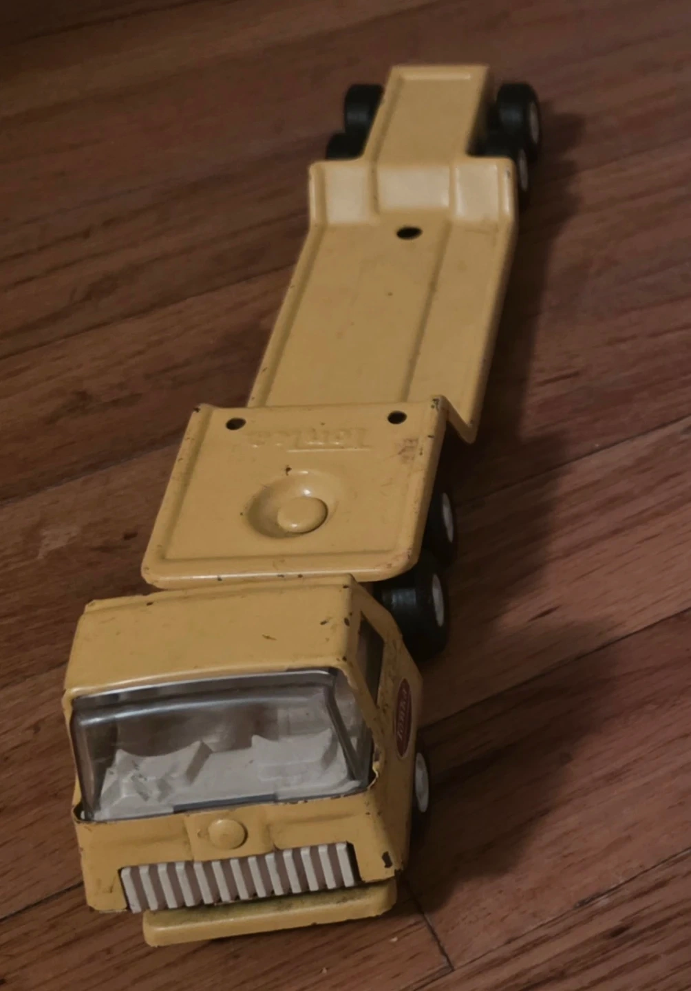 This is a classic yellow metal tow truck by Tonka. It's made of durable metal. This toy truck is great for imaginative play!