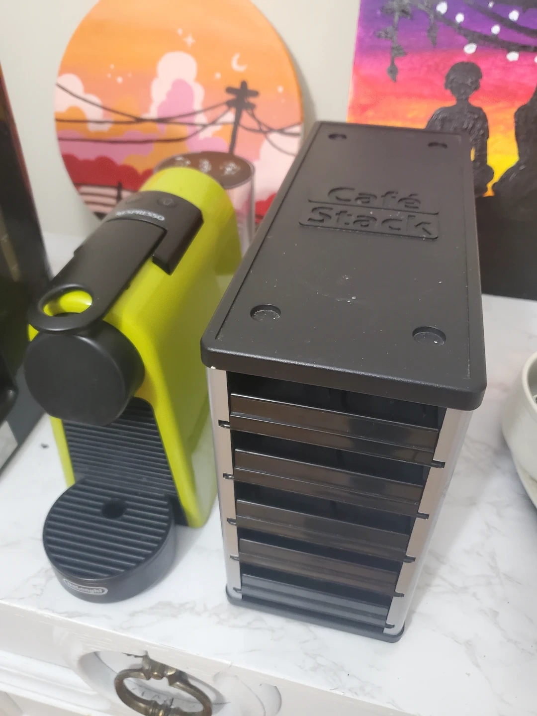 Selling a DeLonghi Nespresso Essenza Mini in a fun lime green colour! It's a compact and easy-to-use machine for your daily coffee fix. Also included is a Cafe Stack pod holder to keep your pods organized