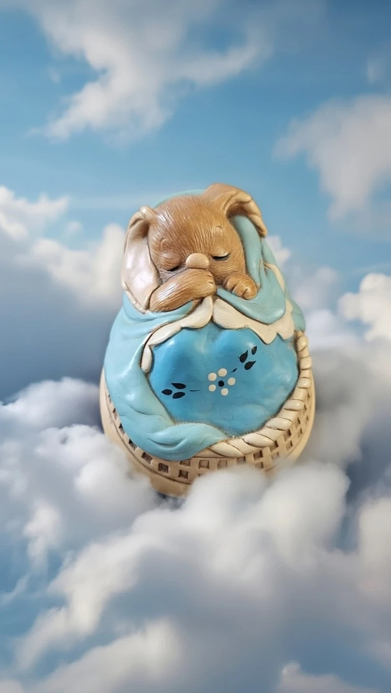 This is a charming "Poppets" figurine from Pendelton, featuring a hand-painted bunny sleeping in a blue blanket. It's made from stonecraft and displays intricate detailing. This sweet piece would make a lovely addition to any collection or shelf!