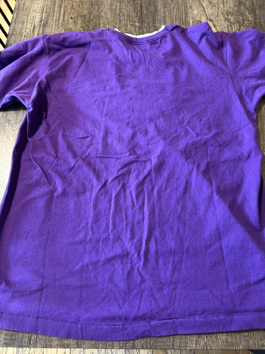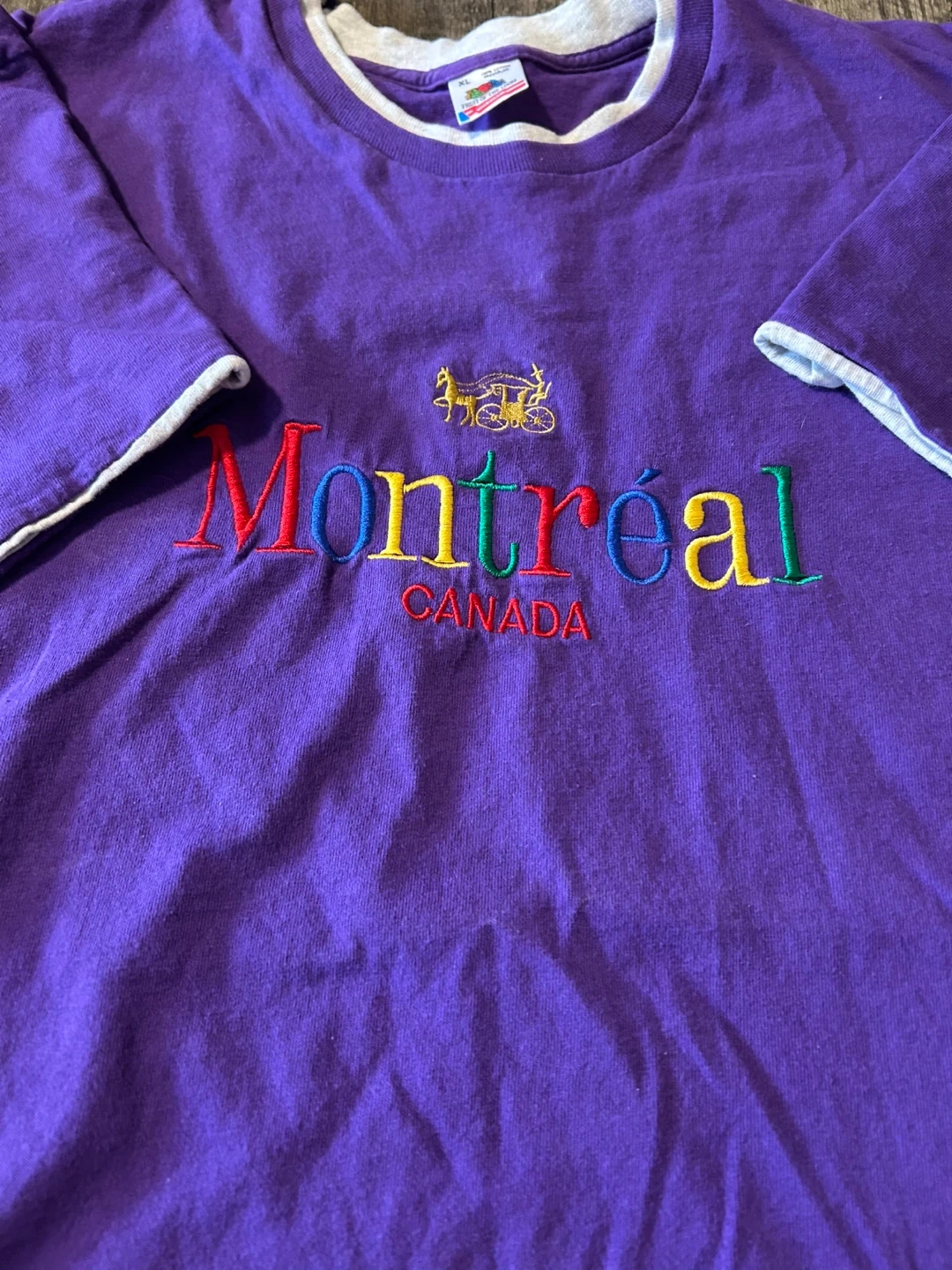 This is a vintage purple Fruit of the Loom t-shirt with "Montreal Canada" embroidered on the front. It's a size XL with a grey contrasting neckline and sleeve trim. 100% cotton preshrunk material.