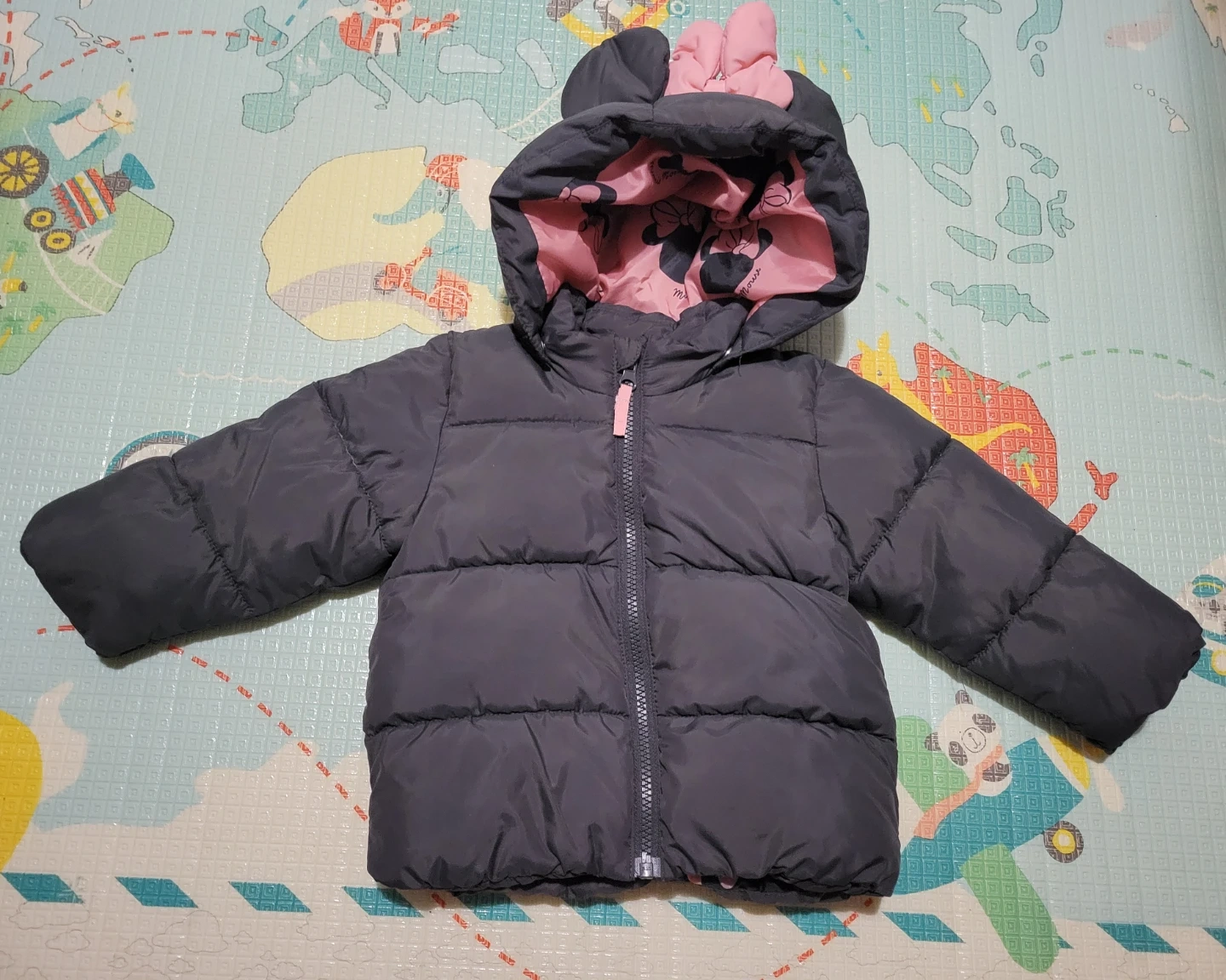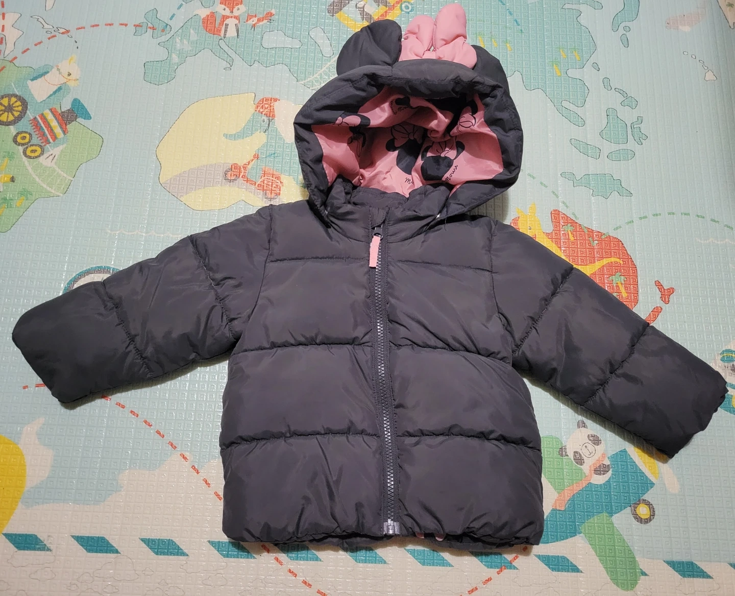 A cute puffer jacket for kids featuring Minnie Mouse ears on the hood and a pink interior lining with Minnie Mouse prints. It's a dark grey outer shell with a full zip closure. Perfect for keeping your little one warm and stylish!