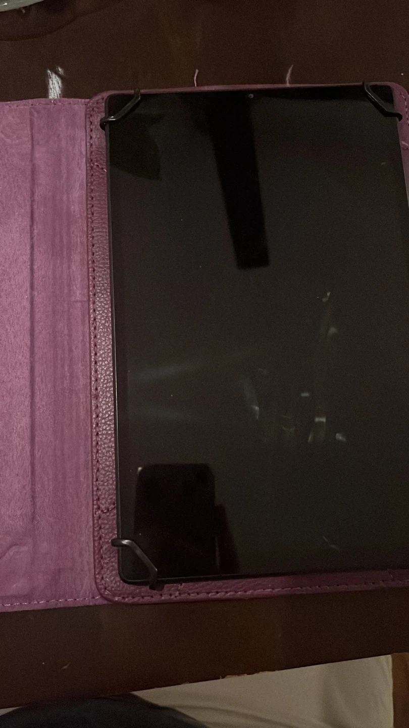 This Lenovo tablet has a 10-inch display with 32GB of ROM and 2GB of RAM. It runs on Android version 10 and features a MediaTek Helio P22T Octa-core 2.3GHz CPU. The camera is 8MP rear and 5MP front. It's housed in a purple case.