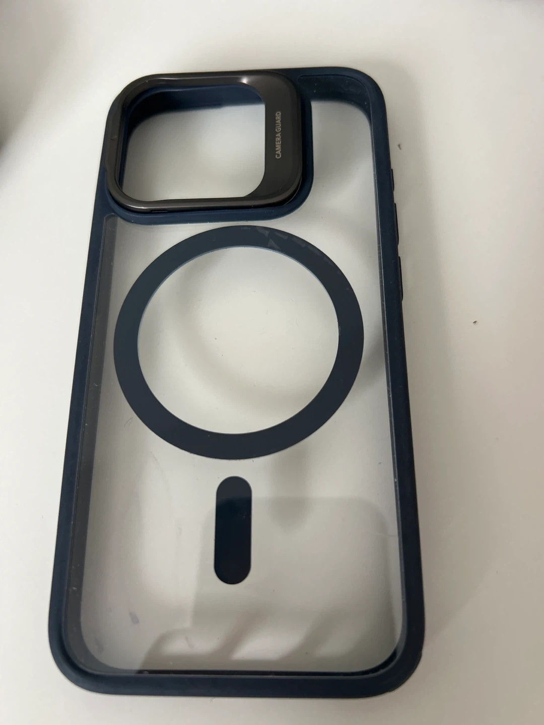 This is an ESR HaloLock Magnetic Case, designed for phones. It features a magnetic ring for MagSafe compatibility and a camera guard for protection. The case is clear with dark blue trim and for iPhone 14 Pro.