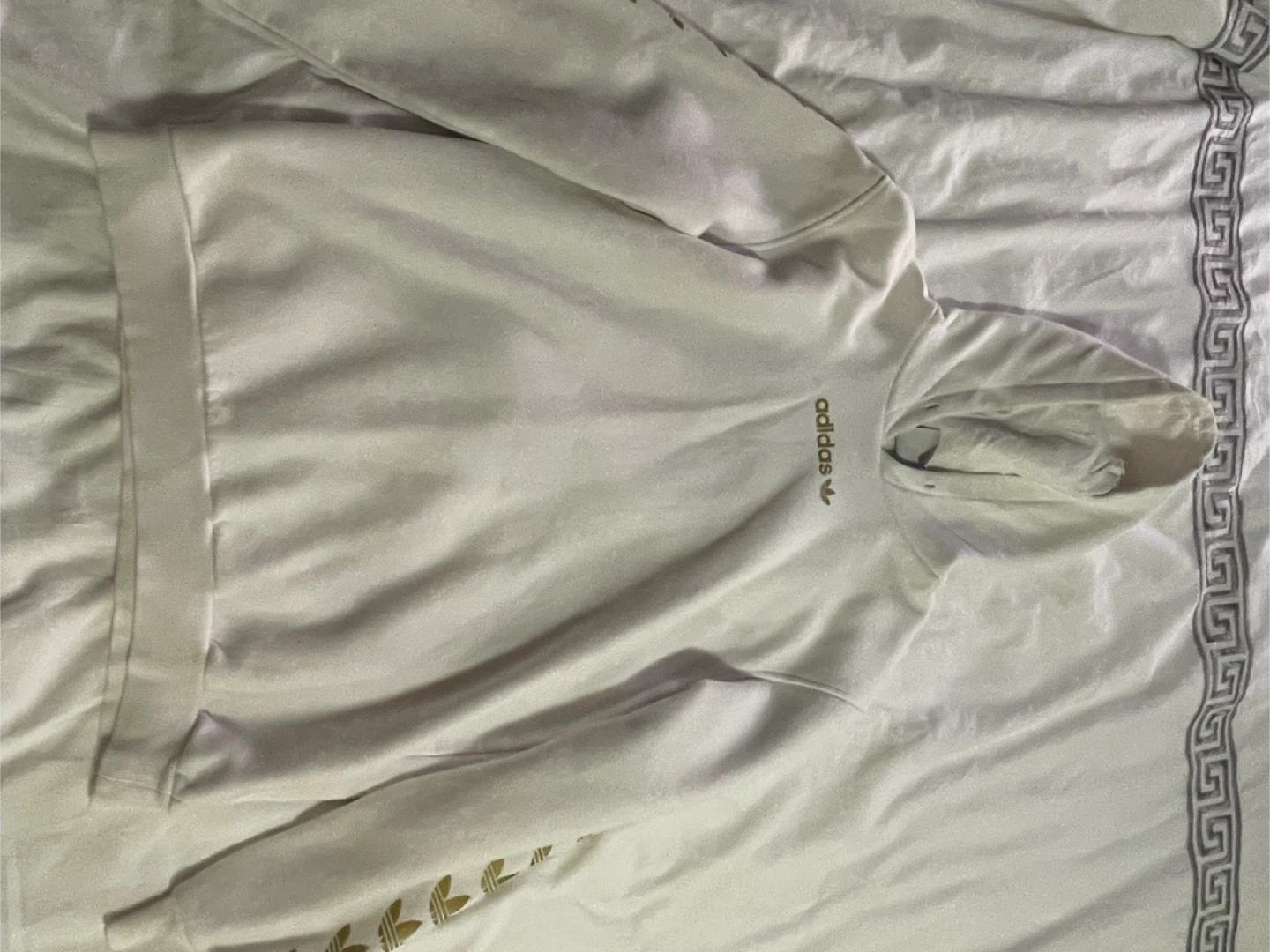 This is a white Adidas hoodie with gold detailing. It features the iconic Adidas logo and three stripes design on the sleeves. Made from comfortable material, it's suitable for casual wear.
