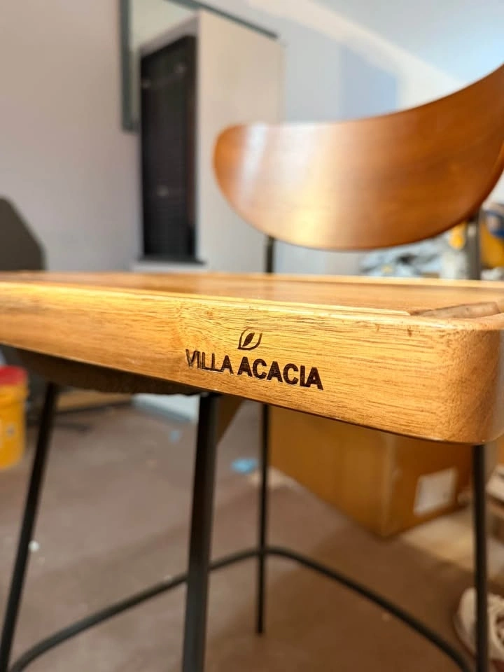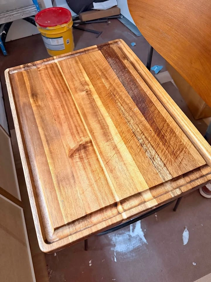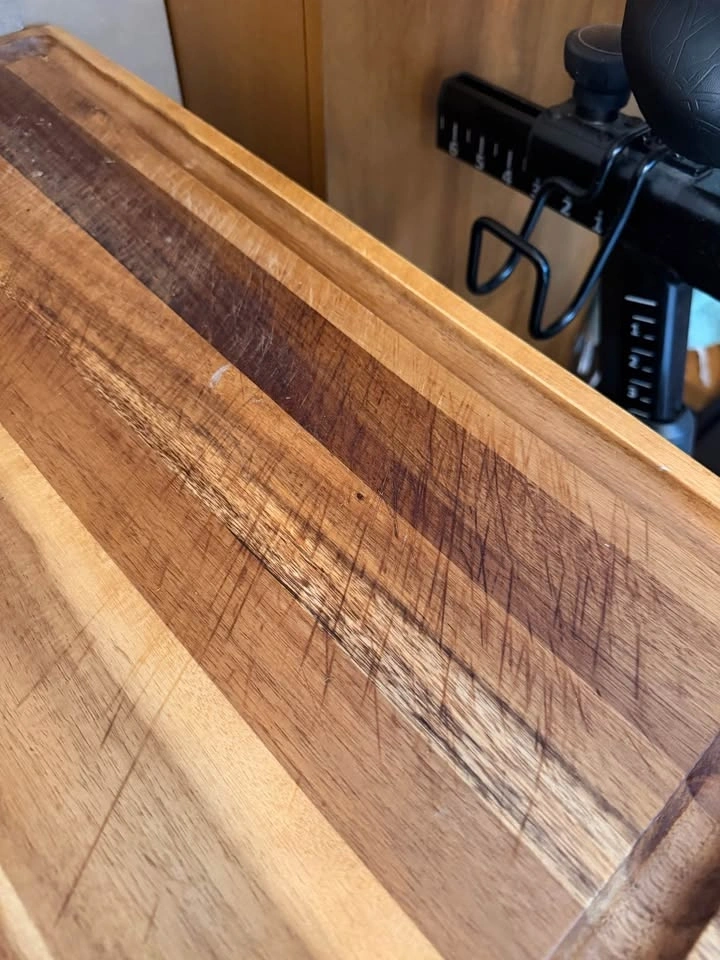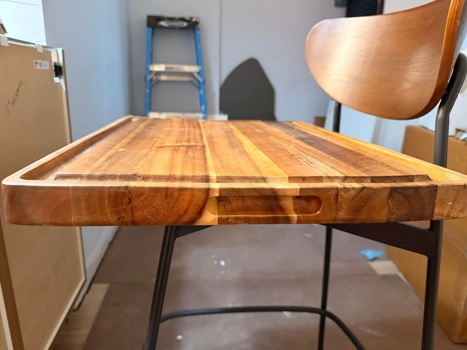 Made of premium Acacia wood. Dimensions: 24”x18”x1.5”. Used for about a year and has signs of use (see photos).