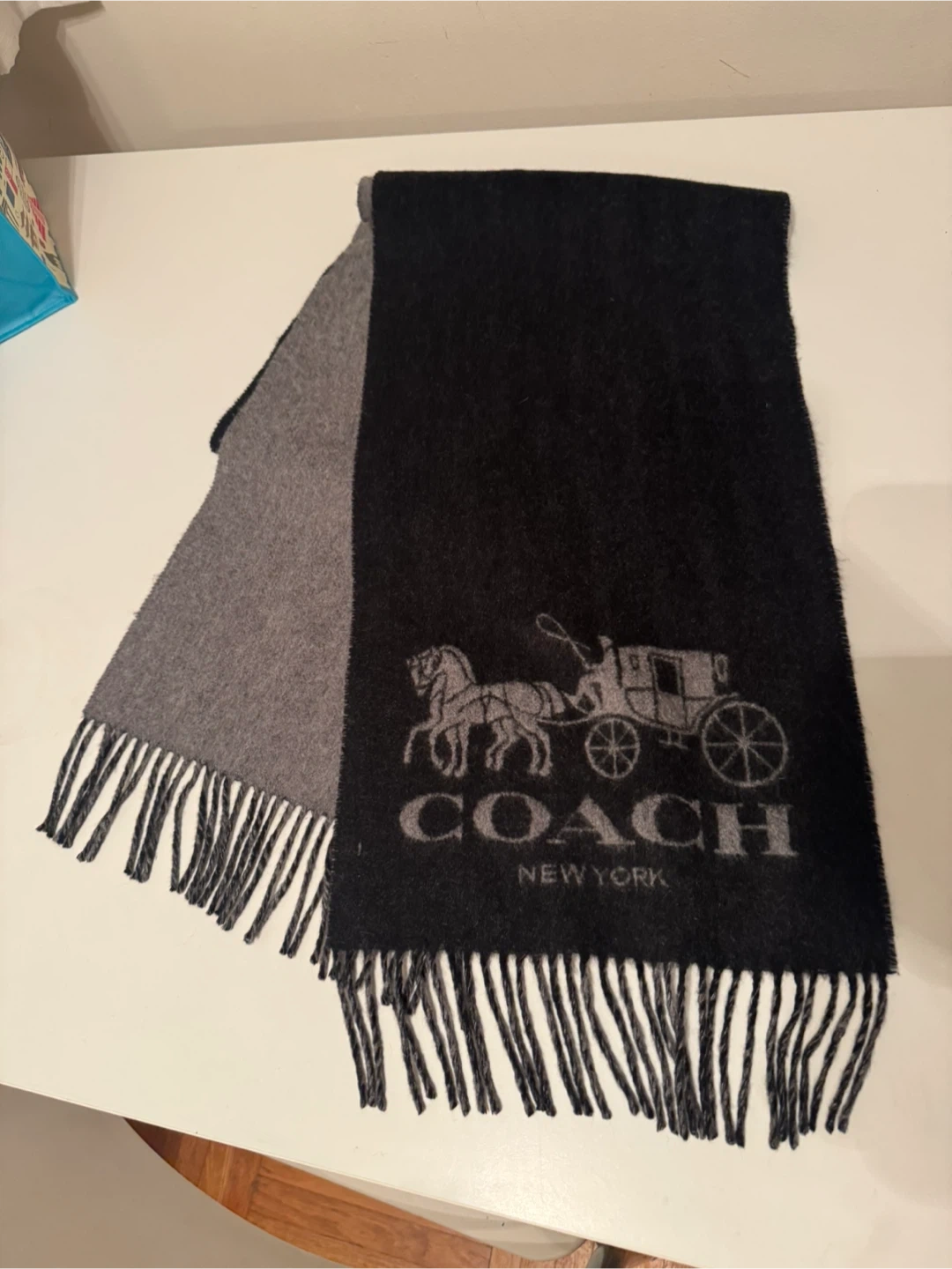 This is a Coach scarf featuring the classic horse and carriage logo. It's reversible, with one side black and the other grey. It has fringed edges for a stylish look.