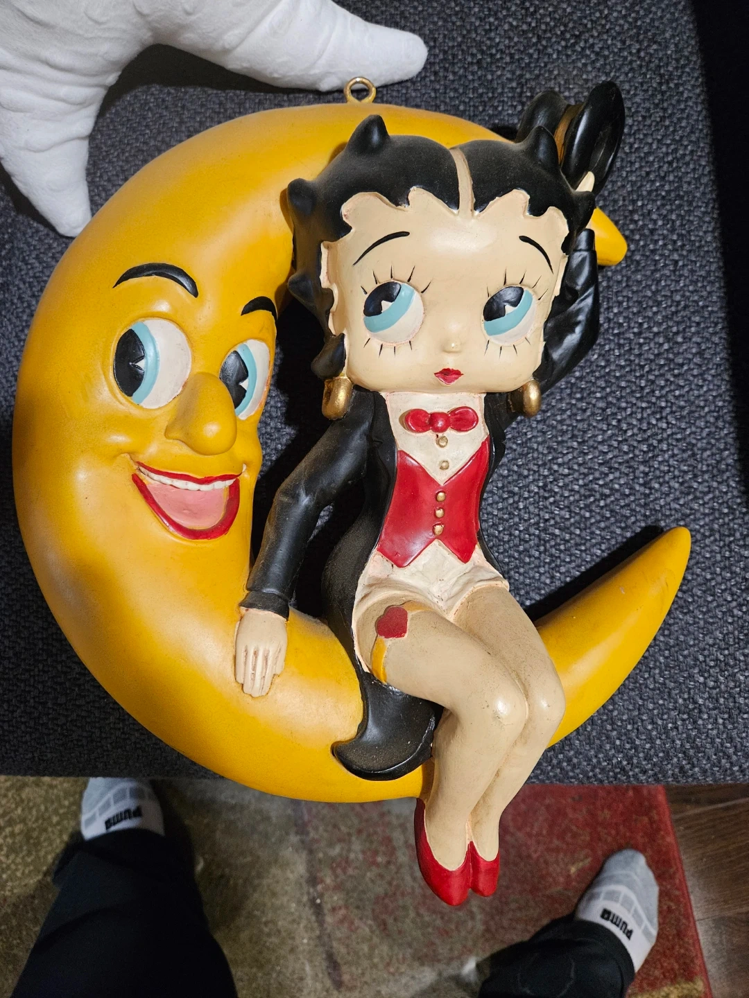 This Betty Boop "Moonglow" figurine depicts the iconic character sitting on a cheerful crescent moon. It was created by the Danbury Mint in 1998. Crafted from resin and hand-painted, this piece shows some cracks however structurally sound and solid!