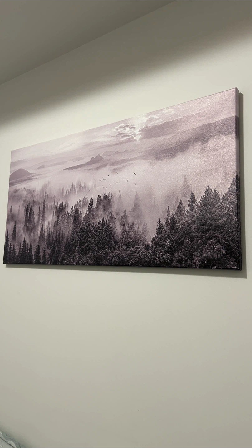 A long canvas print featuring a misty forest landscape. The art displays evergreen trees shrouded in fog with mountains in the distance and birds flying.