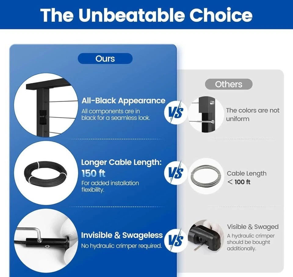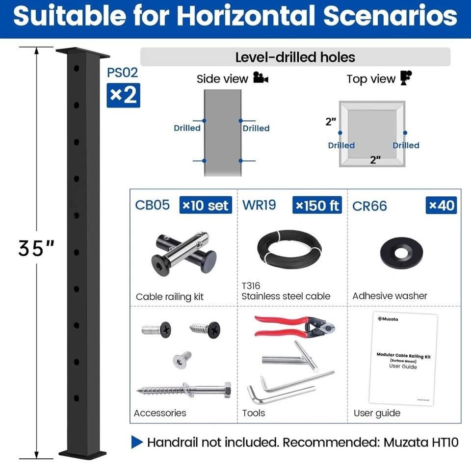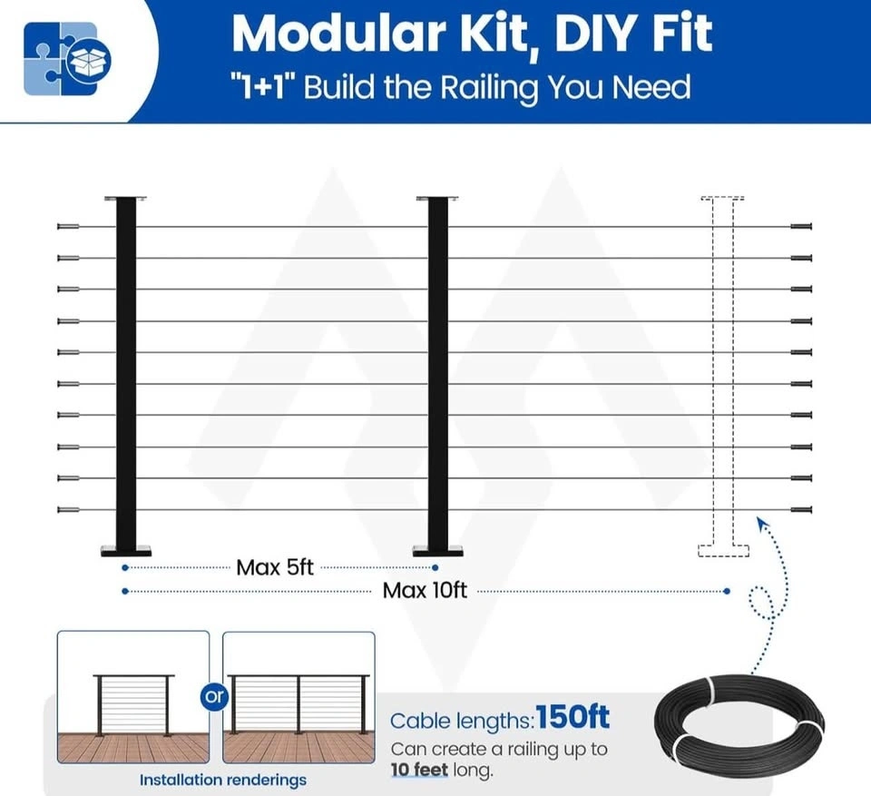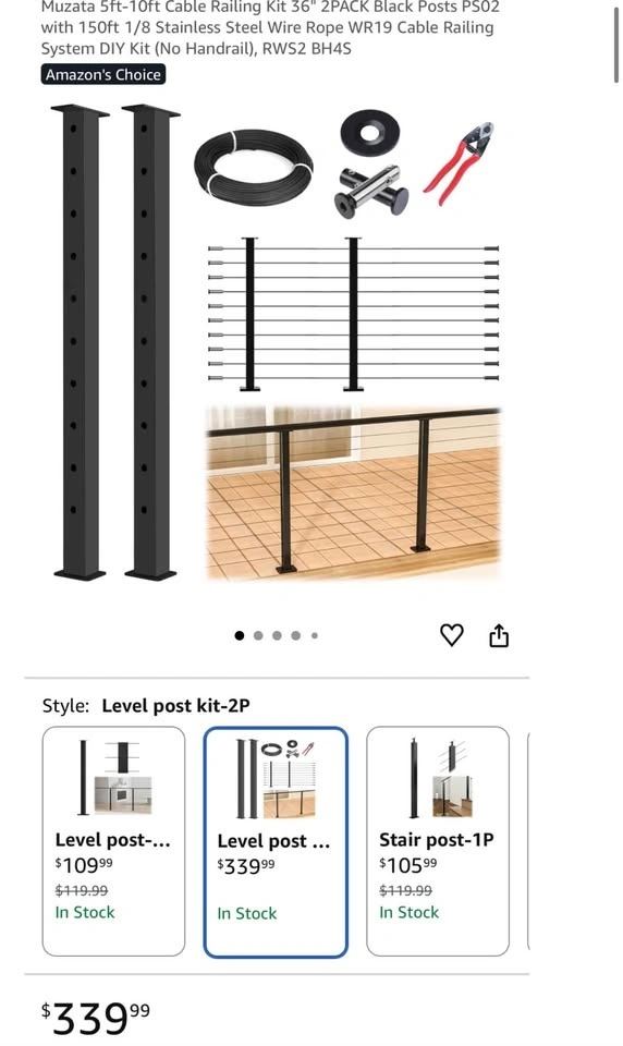 Brand new Muzata cable railing system DIY kit. Includes two 36" black posts (PS02) suitable for 5–10 ft spans and 150 ft of 1/8" stainless steel wire rope (WR19). Perfect for deck, balcony, or stair railing projects with a clean, modern look.