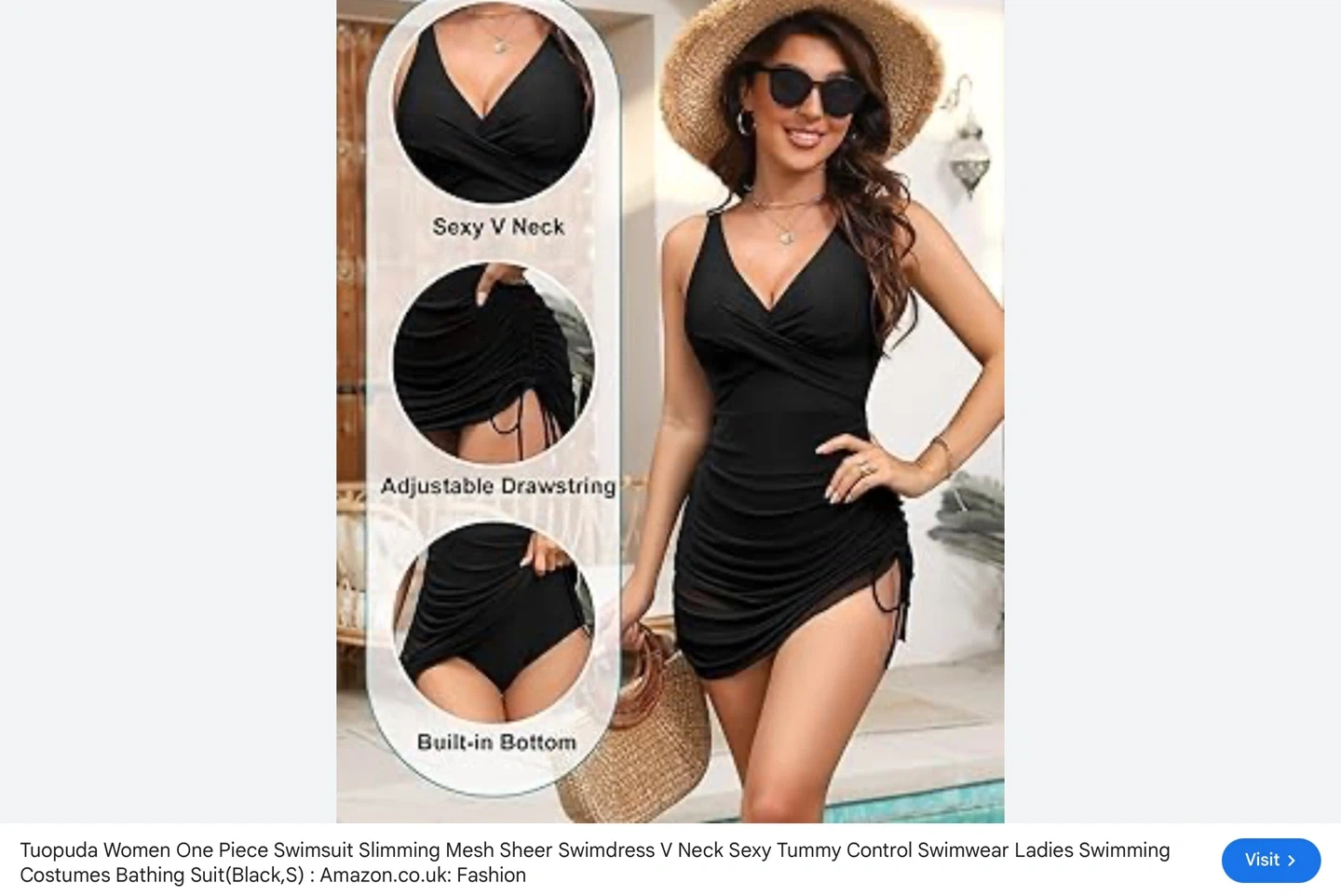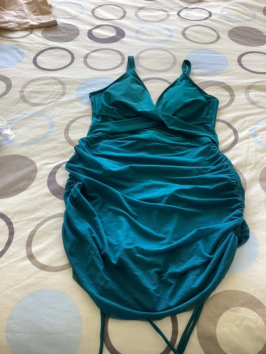 This one-piece swimsuit features a V-neck and adjustable drawstring for a custom fit. It has a built-in bottom and mesh sheer overlay. I have one in teal and one in black both size medium.