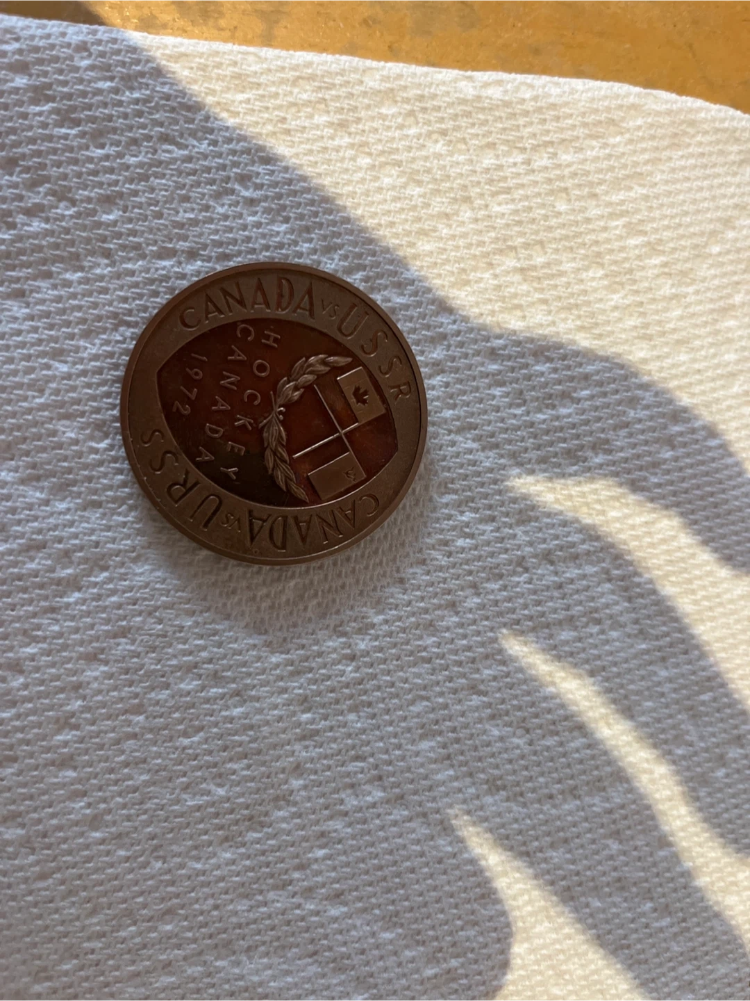 Commemorative coin from the 1972 Canada-USSR Hockey Summit Series. It's a unique piece of Canadian sports history. This coin marks a significant event in international hockey. It's a great collectible for hockey fans!
