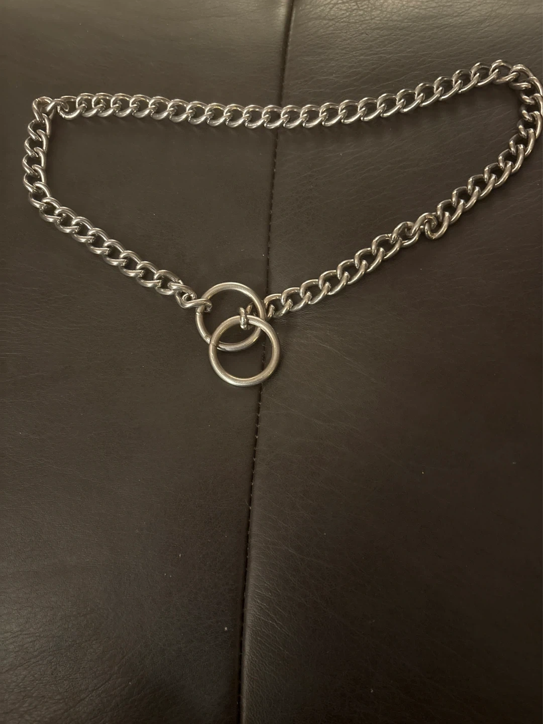 A cool silvertone chain necklace featuring two interlocking rings. It's made of metal and perfect for adding an edgy touch to any outfit. This necklace is a great accessory for those who love bold styles! Search online says dog collar or slave chain