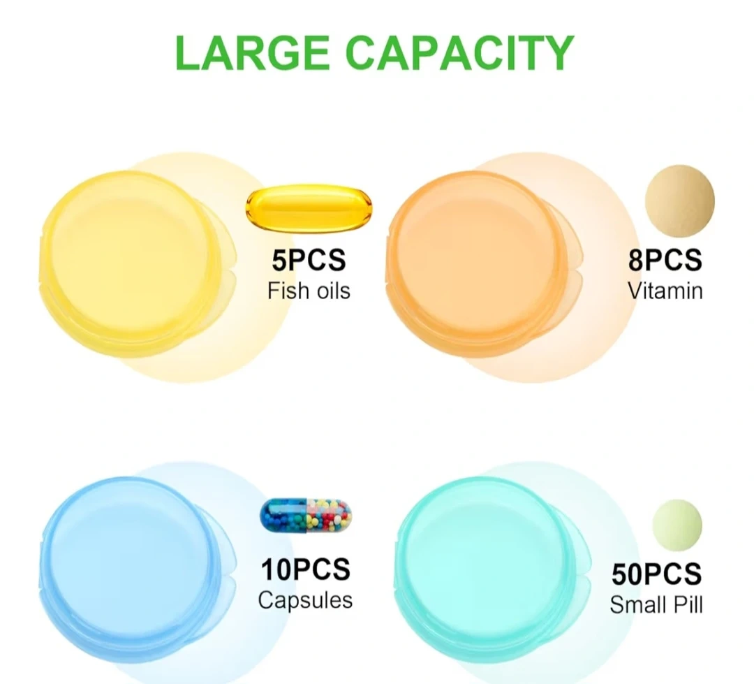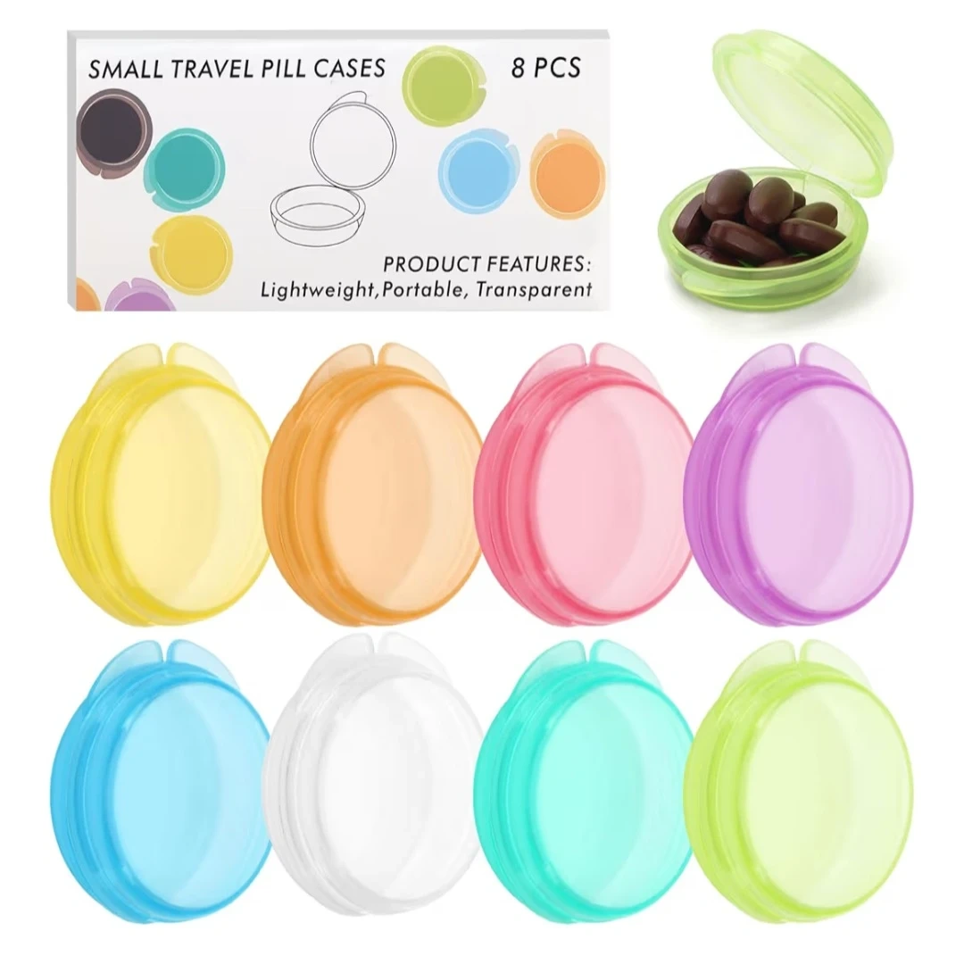 Small Pill Case,8 Pack Travel Round Pill Boxes,Portable Mini Daily Pill Organizer Container,Tiny Medicine Storage for Pocket Purse,Clear Compact Caddy Dispenser for Vitamin, Cod, Liver Oil - Colored