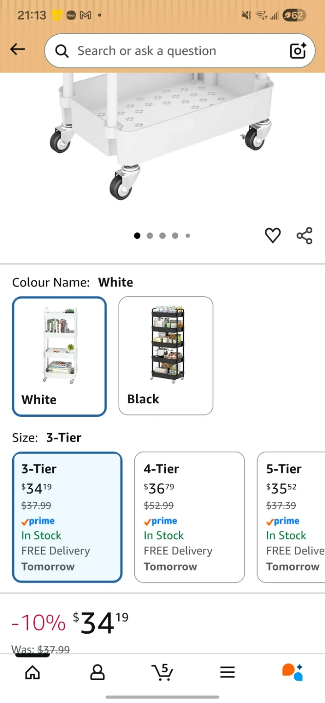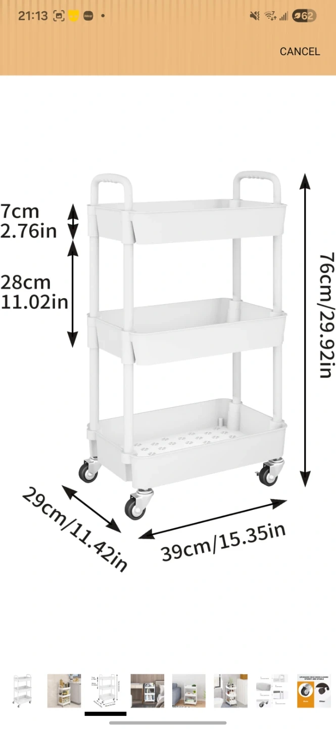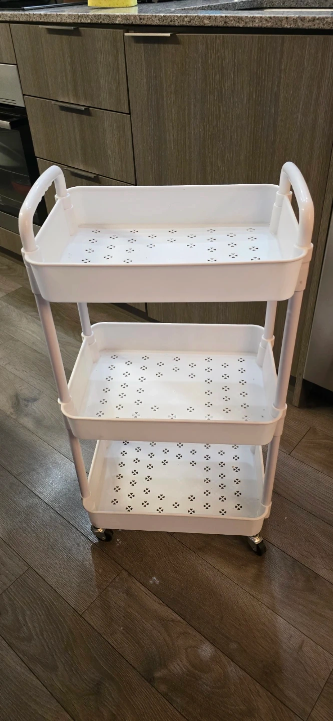 This is a 3-tier rolling storage cart in white. It measures 76cm tall, 39cm wide, and 29cm deep. The cart has wheels for easy mobility. It's great for organizing various items around the home.