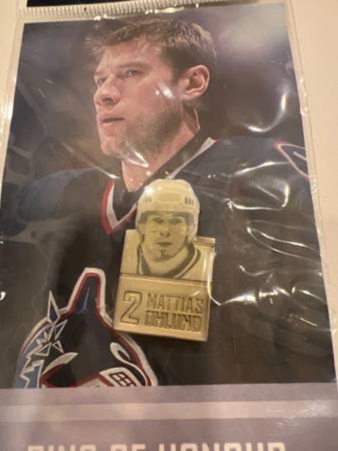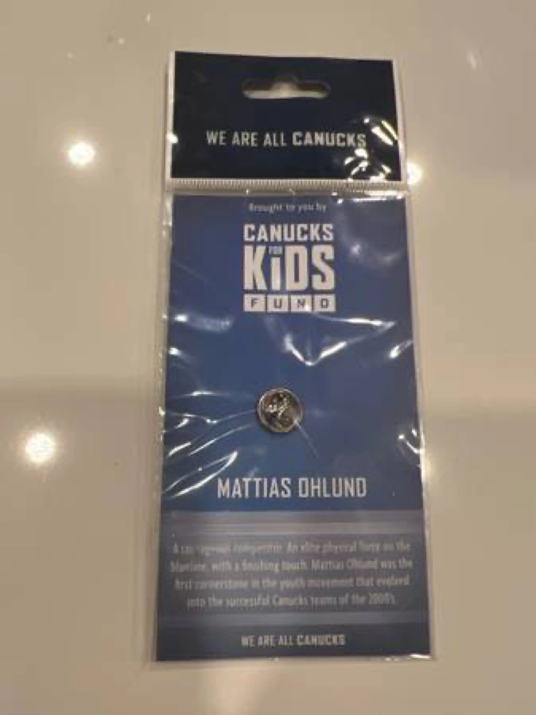 Mattias Ohlund Ring of Honour pin. Comes in original packaging. The pin depicts Ohlund's face and number. The packaging includes a photo of Ohlund and a description of his career. It is a Canucks Kids Fund pin.