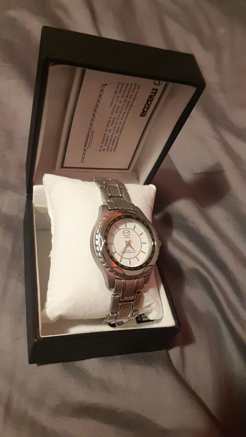 This is a Mazda branded quartz watch. It comes in its original presentation box. The watch has a silver metal band and a white face.