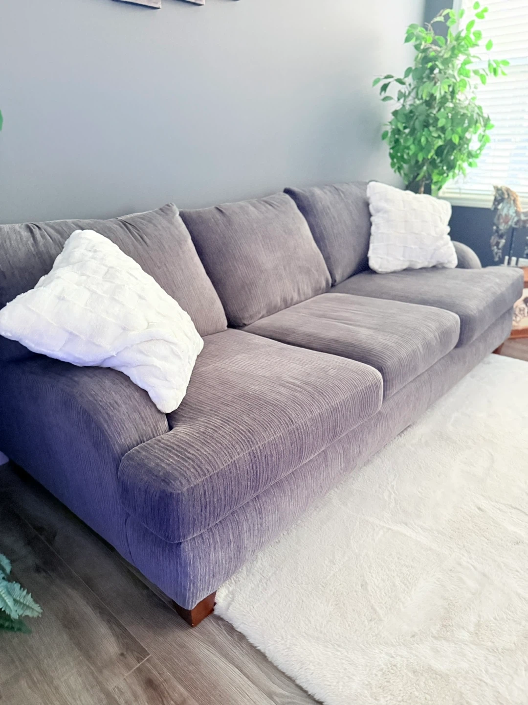 Comfortable three-seater sofa with plush cushions. Upholstered in a soft grey corduroy fabric. It's perfect for any living room space.