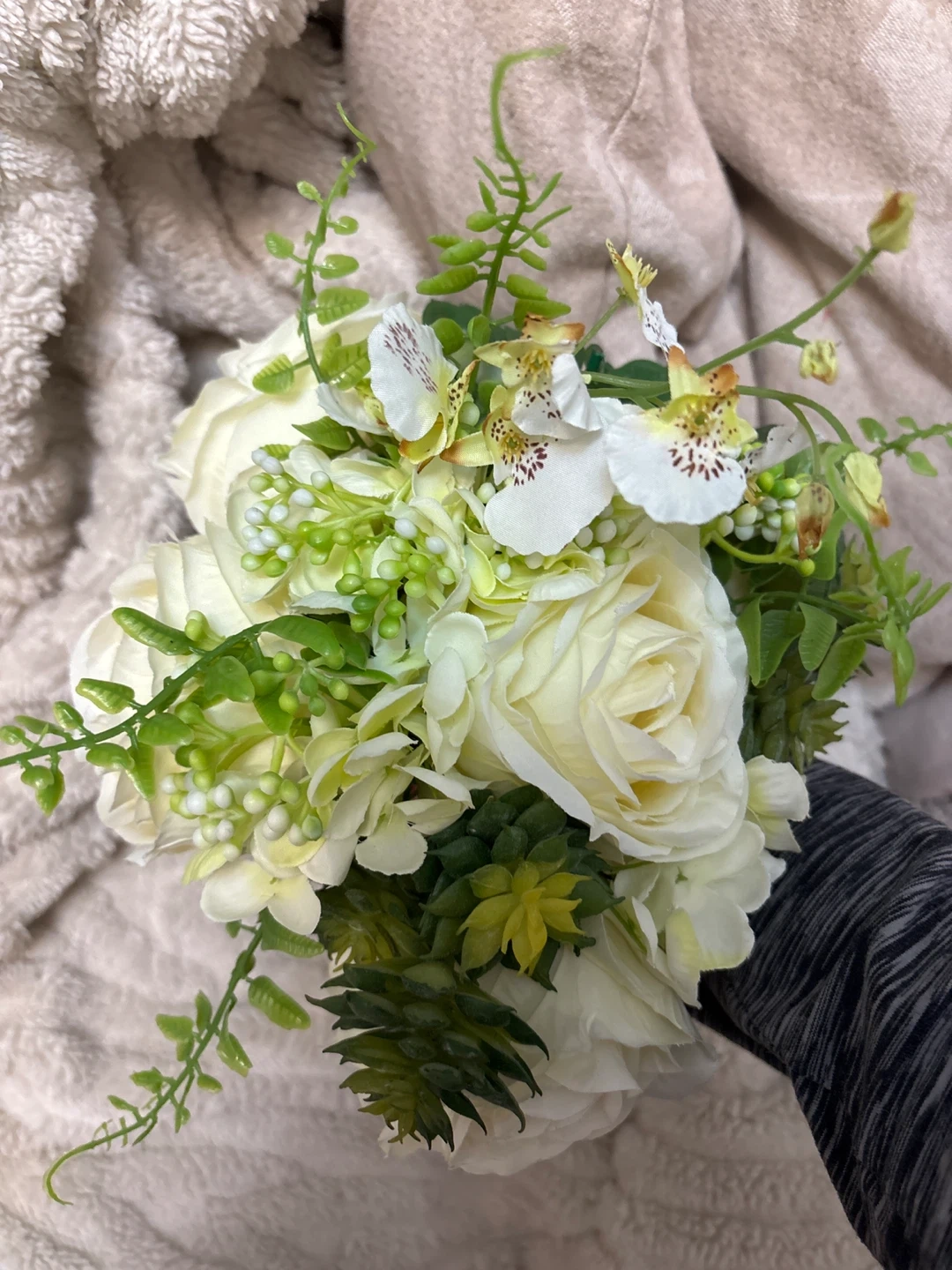 This charming artificial flower bouquet features white roses and various green foliage. It's tied with a twine bow at the stems. It'd make a lovely decorative piece for your home or for events!