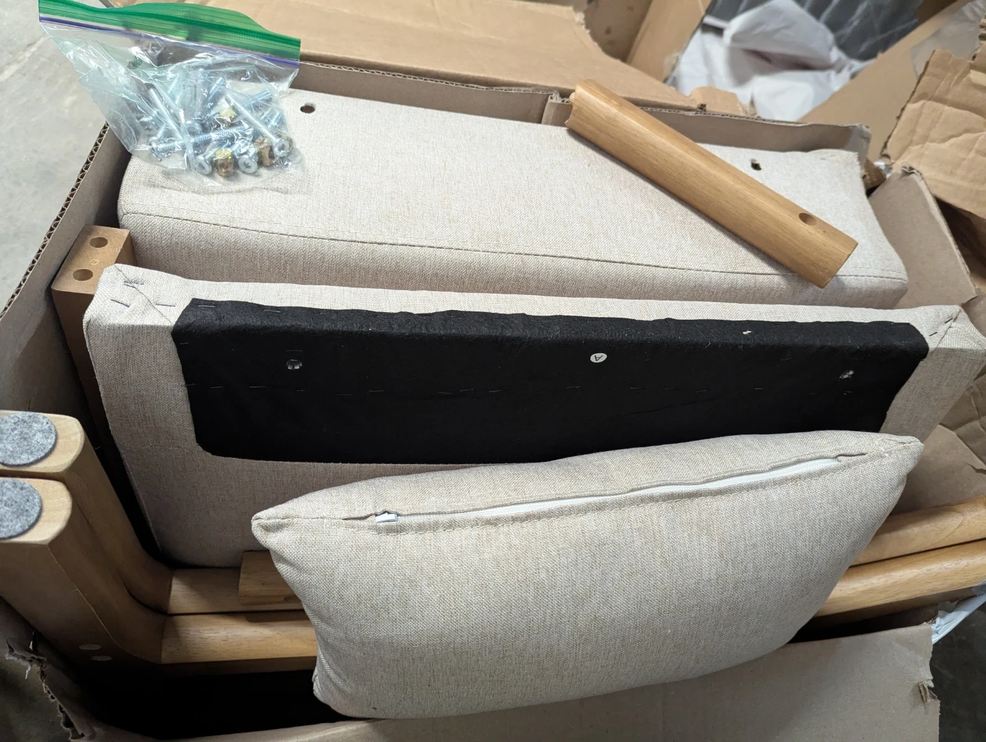 A comfortable accent armchair featuring a light beige fabric upholstery and a natural wood frame. It includes a matching lumbar pillow for added support. The overall dimensions are 32" deep by 26" wide and 29" high.