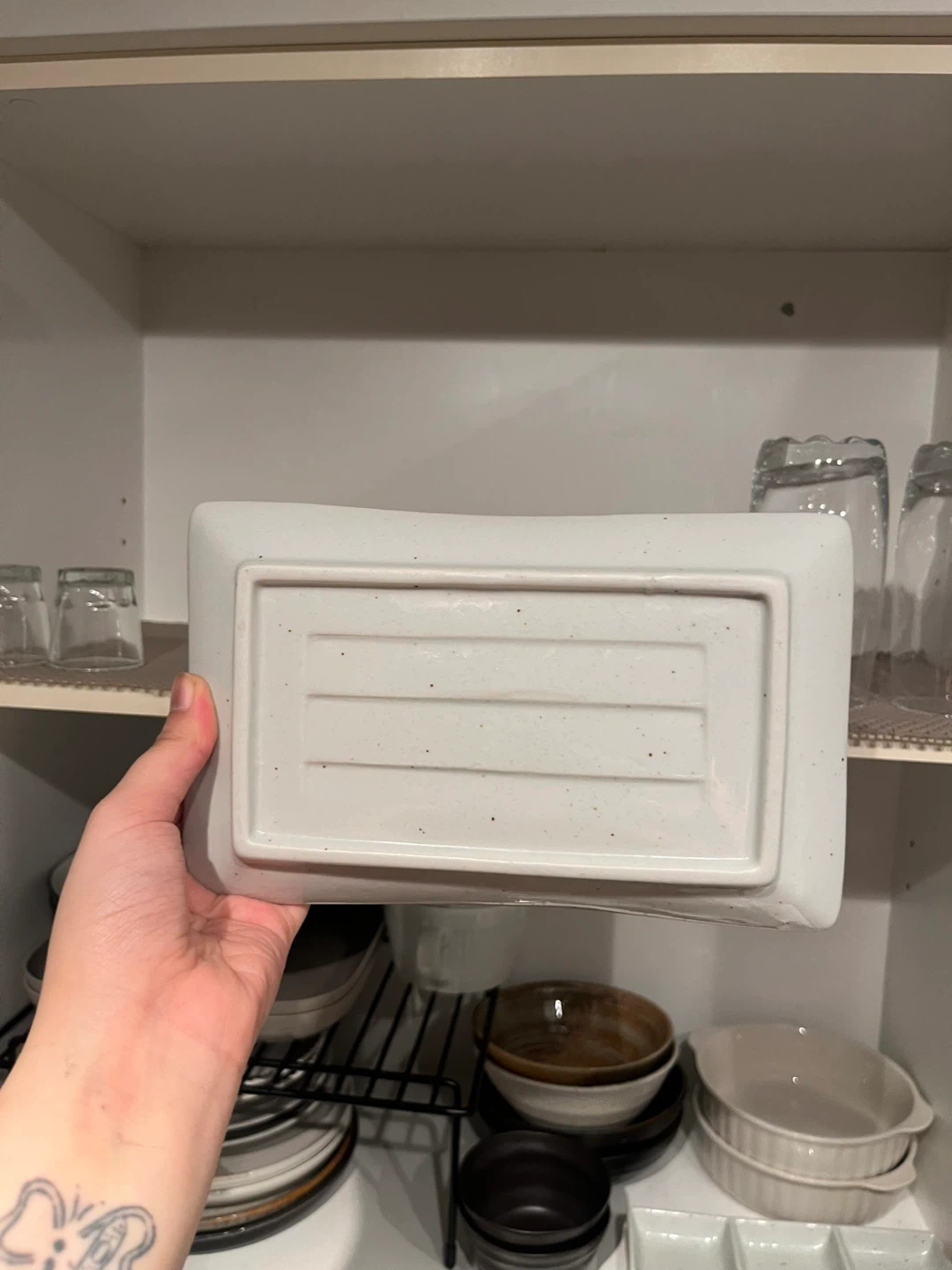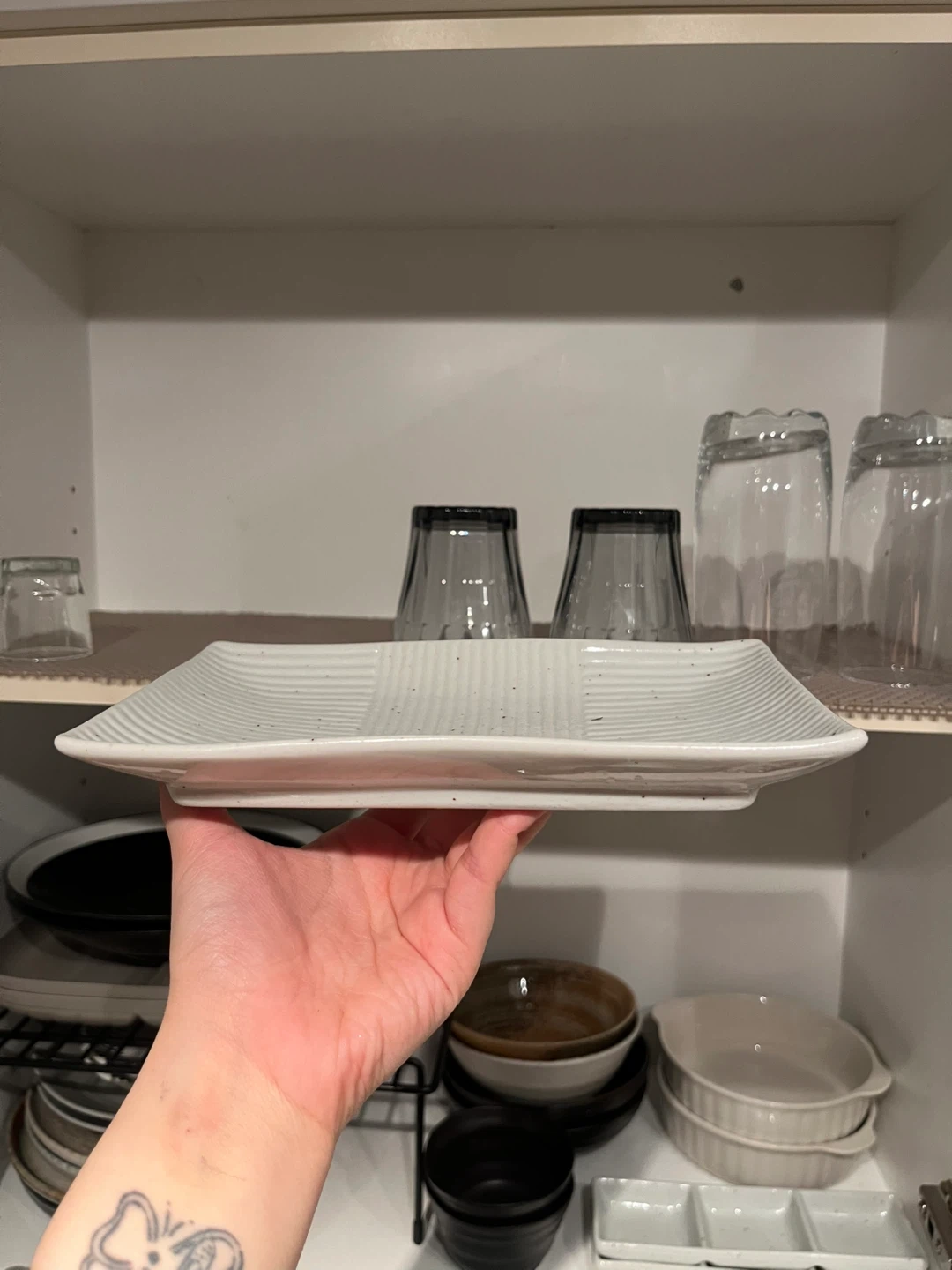 This is a light grey rectangular serving dish with a textured pattern. It's made of ceramic. It's good for serving appetizer or side dishes. Made for anything, doesn’t have to be sushi. Very good quality.