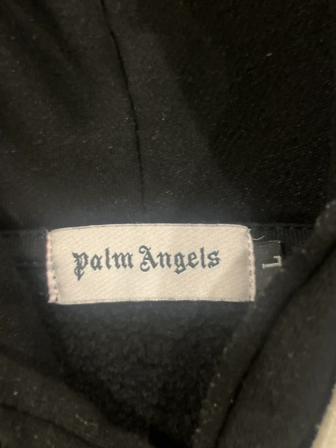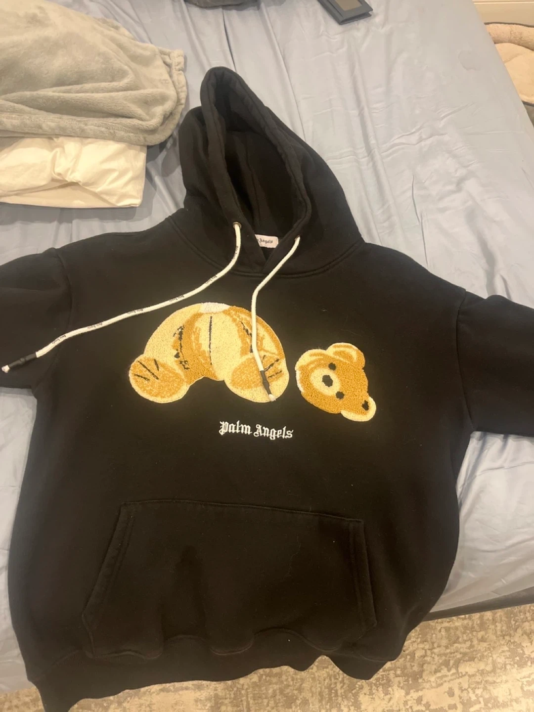 This black Palm Angels hoodie features the iconic teddy bear graphic on the front. It has a drawstring hood and a kangaroo pocket. Made from a soft cotton blend.