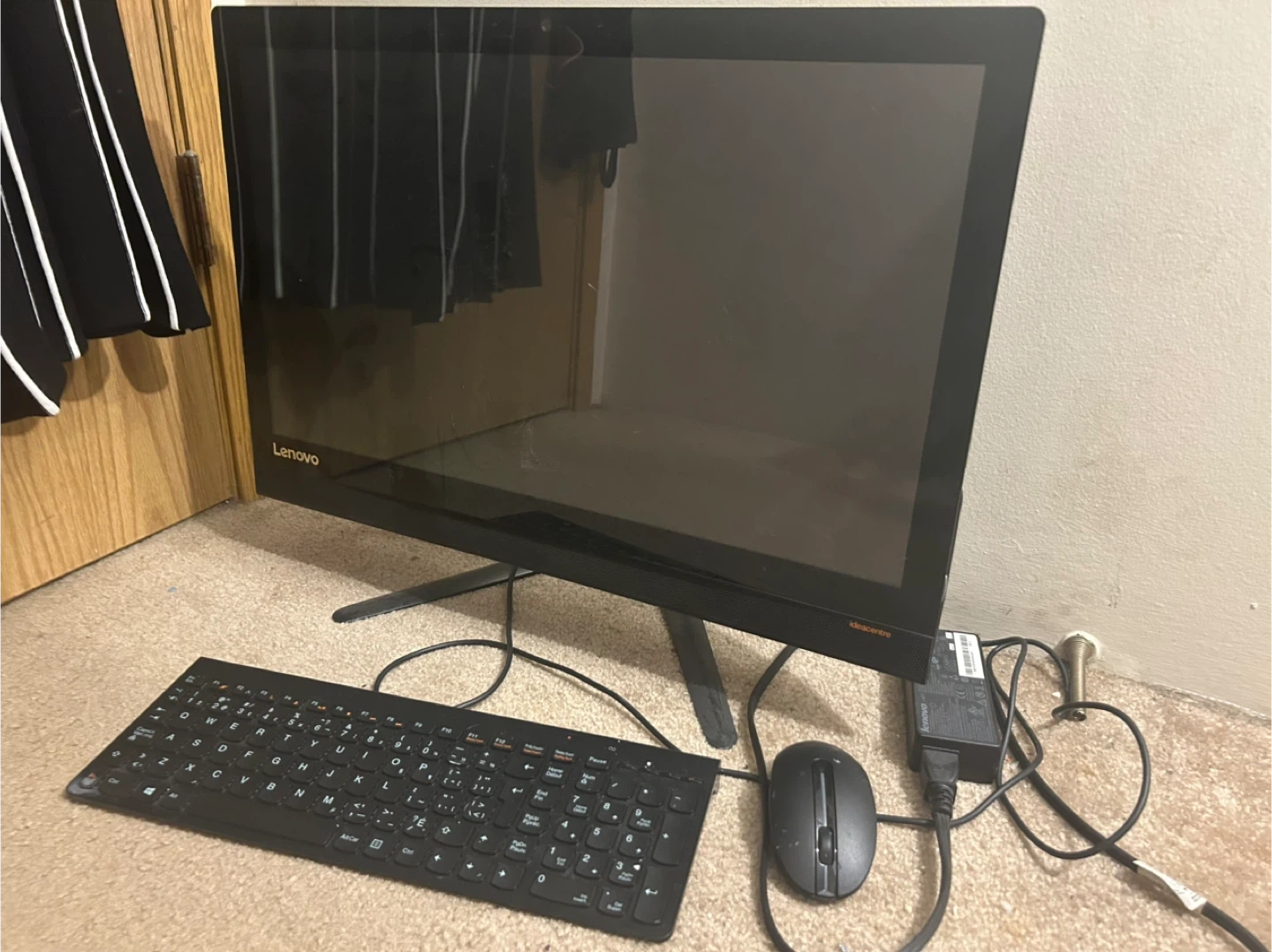 This is a Lenovo IdeaCentre all-in-one computer. It comes with a keyboard and mouse. It's a black model, ready for use.