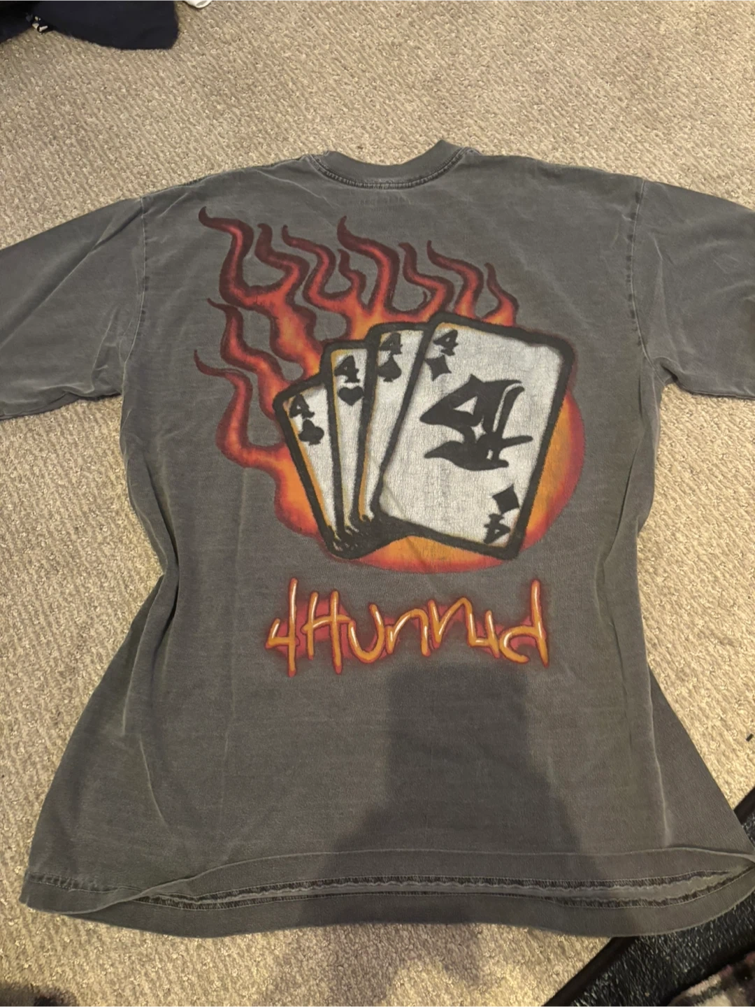 (Very small stain showed in slide 3)Grey graphic t-shirt with "4Hunnid" logo on the front and back. Features playing cards with flames graphic on the back. It's made of cotton.