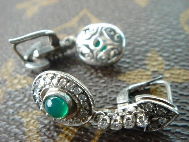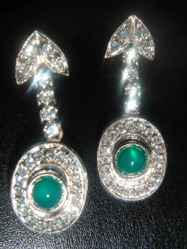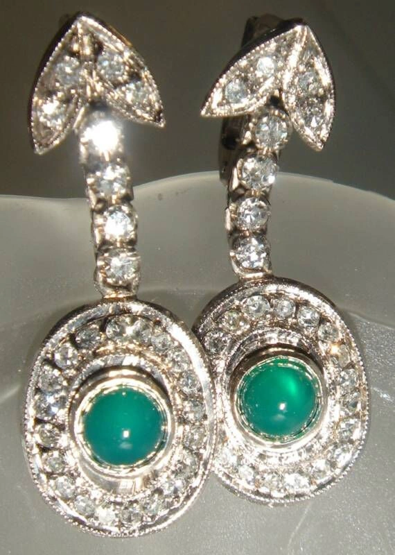 Deco Retro 18K Gold Diamond Chrysoprase Dangle Earrings