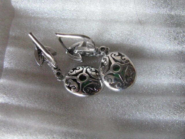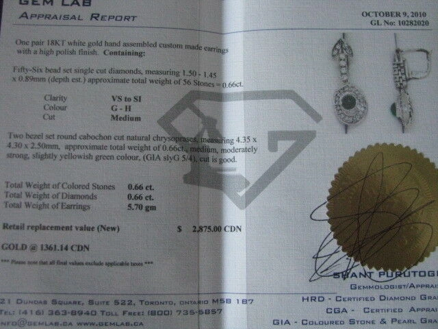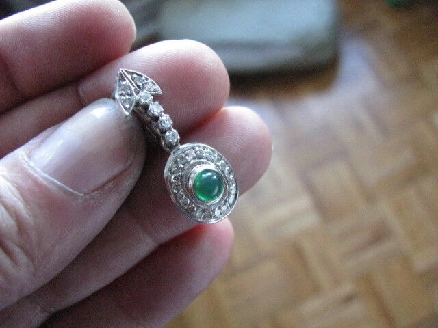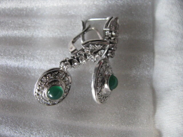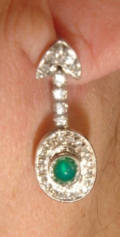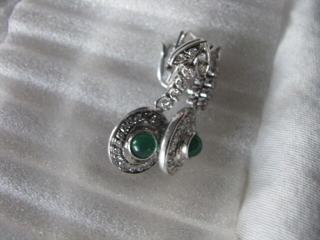 A stunning pair of heirloom 18kt white gold diamond dangle earrings. These feature pierced posts with VS-SI diamonds and a gorgeous natural translucent chrysoprase gemstone. The gemstones are translucent cabochon with old single cut VS-SI diamonds. They weigh 5.7 grams and are about one inch tall. My honest opinion is they are from the Art Deco era, with beautiful beaded detail around the gemstones and edges.